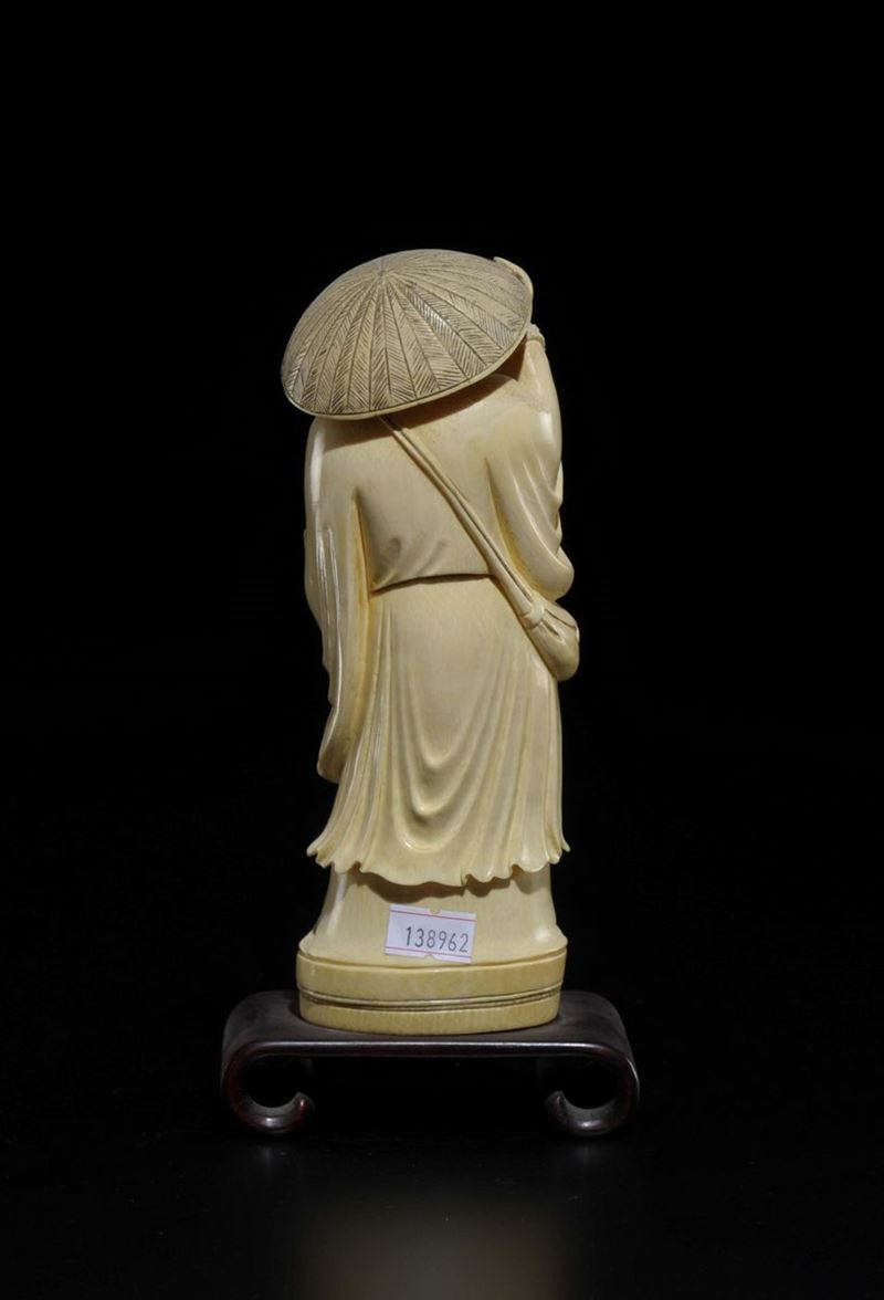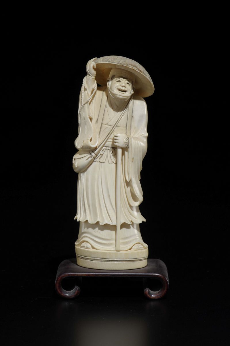 Figura di contadino con cappello e bastone scolpito in avorio, Giappone, inizio XX secolo