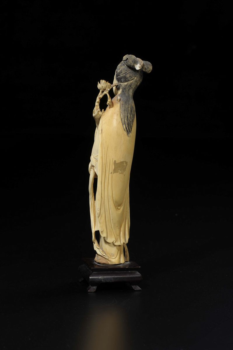 Figura di Guanyin scolpita in avorio con rosa nella mano destra, Cina, inizio XX secolo