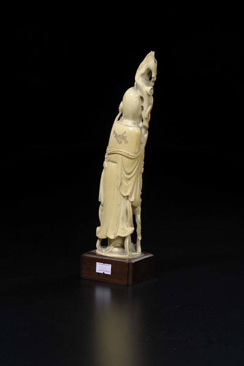 Figura di Shoulao scolpita in avorio con gru e bastone con rami di fiori, Cina, inizio XX secolo