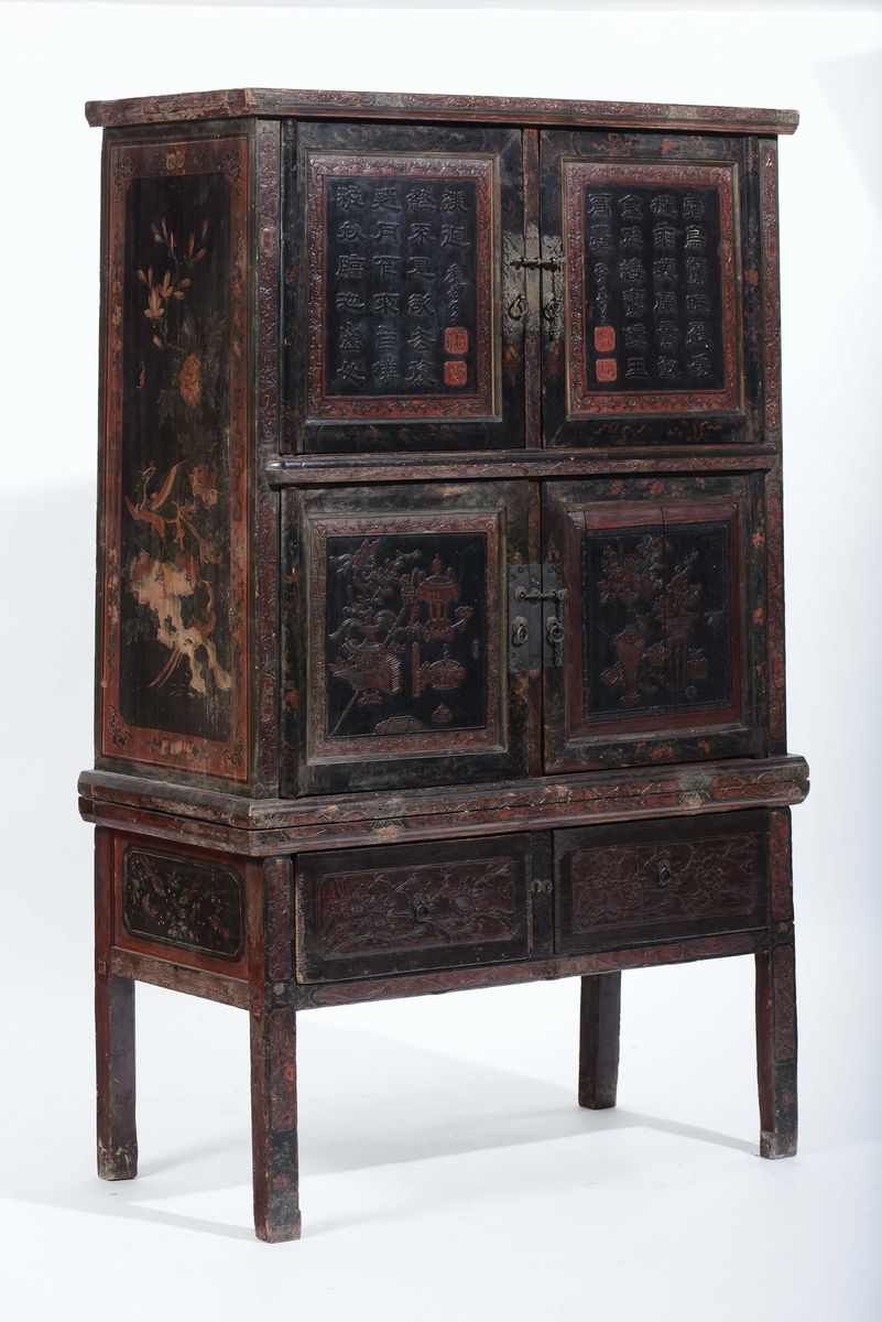 Grande mobile a due ante in legno laccato con decoro floreale, Cina, XX secolo