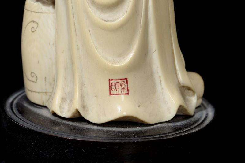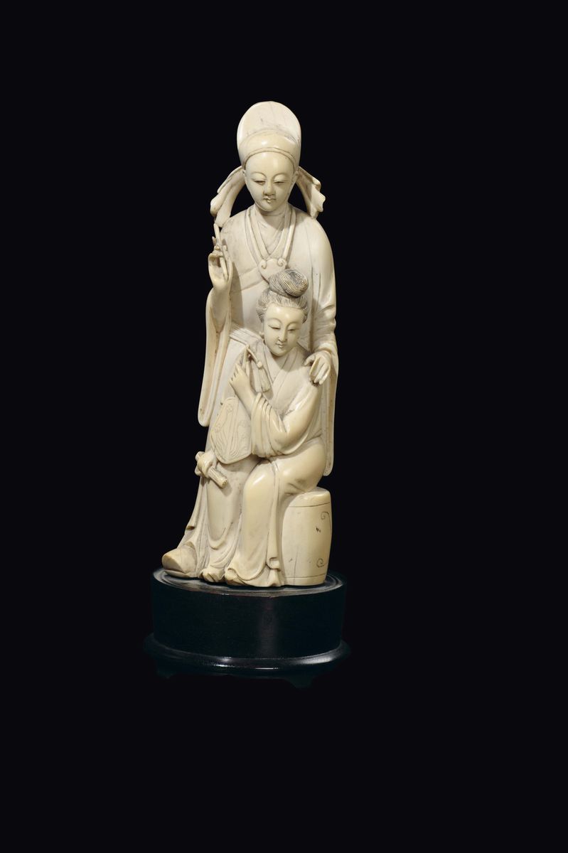 Gruppo in avorio raffigurante Guanyin seduta e dignitario eretto che le posa una mano sulla spalla, Cina, Repubblica, inizio XX secolo