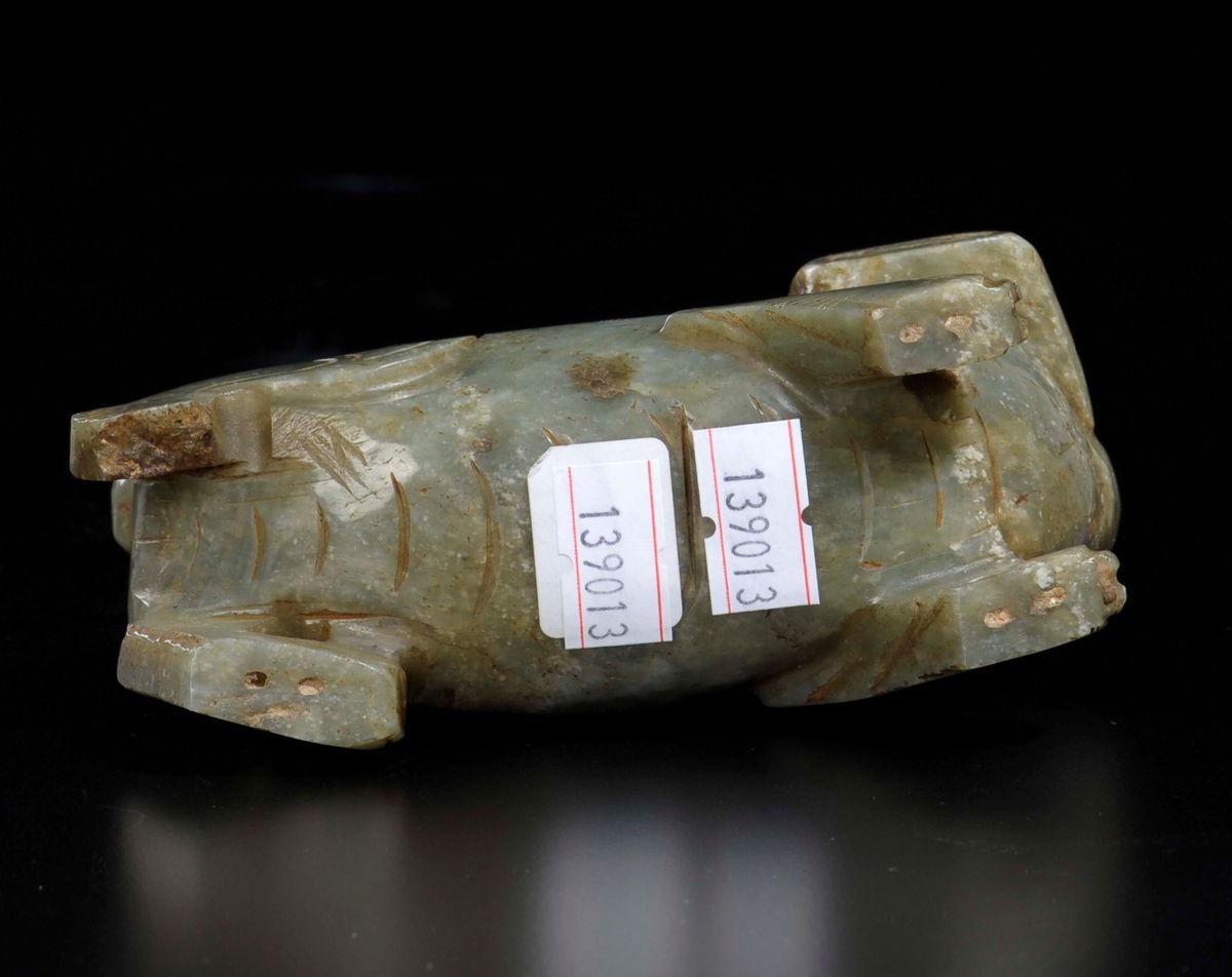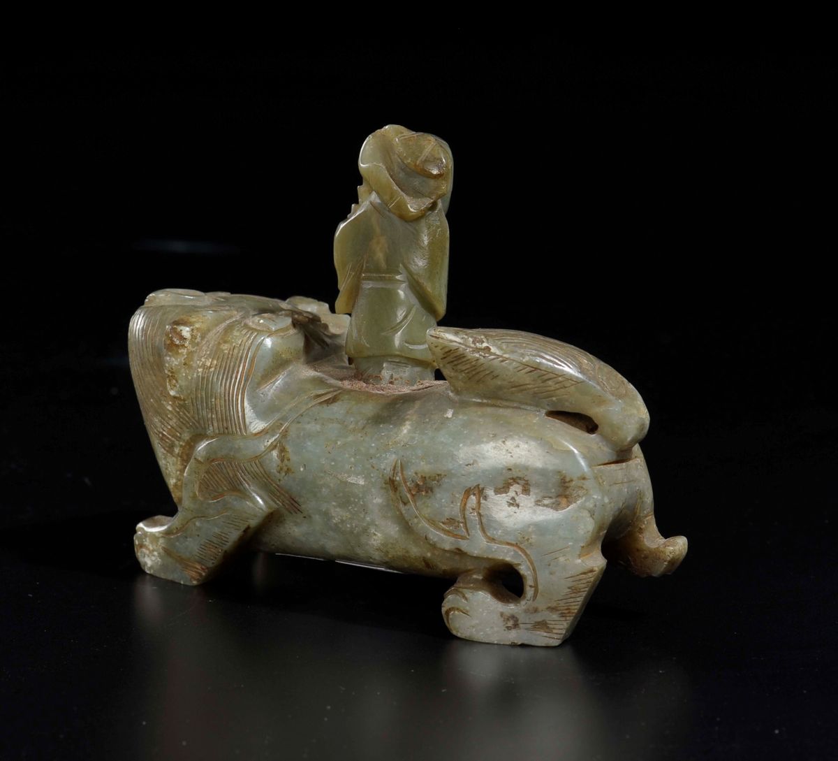 Gruppo scolpito in giada Celadon raffigurante cane di Pho con fanciullo sulla schiena, Cina, Dinastia Qing, epoca Qianlong [..]