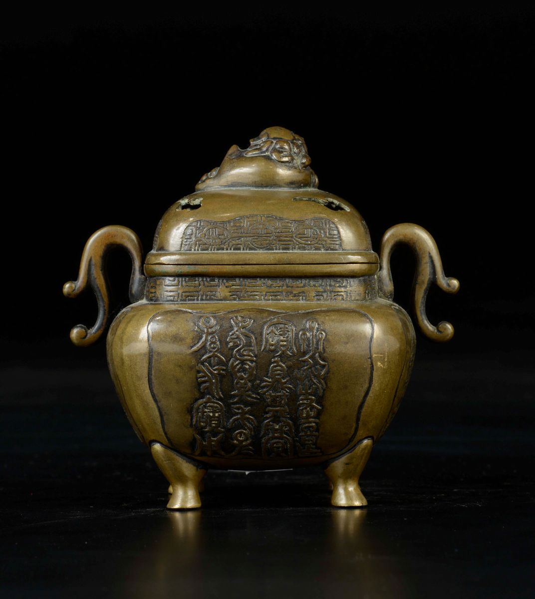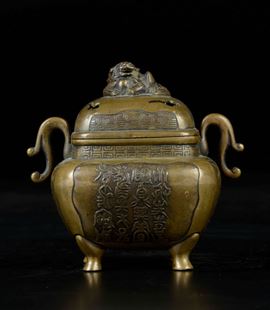 Incensiere in bronzo con manici e coperchio ed iscrizioni a sbalzo, Cina, Dinastia Qing, fine XIX secolo