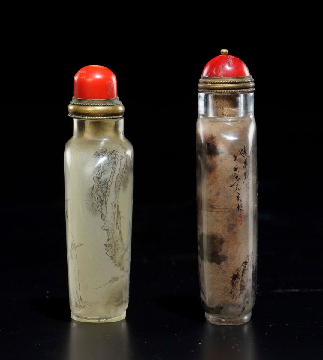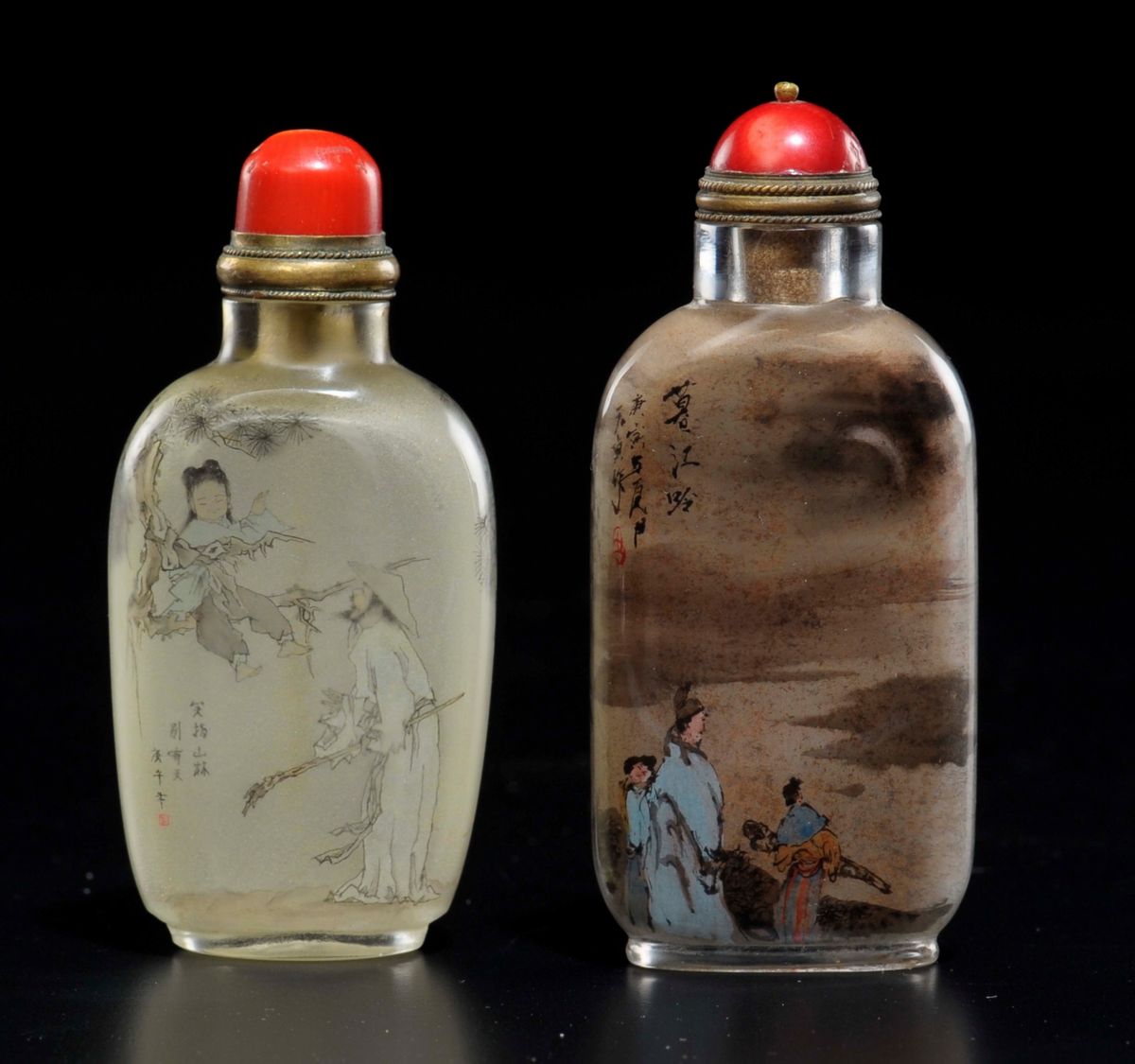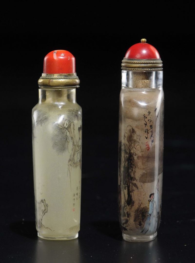 Lotto di due snuff bottles in vetro dipinto con personaggi e iscrizioni, Cina, XX secolo