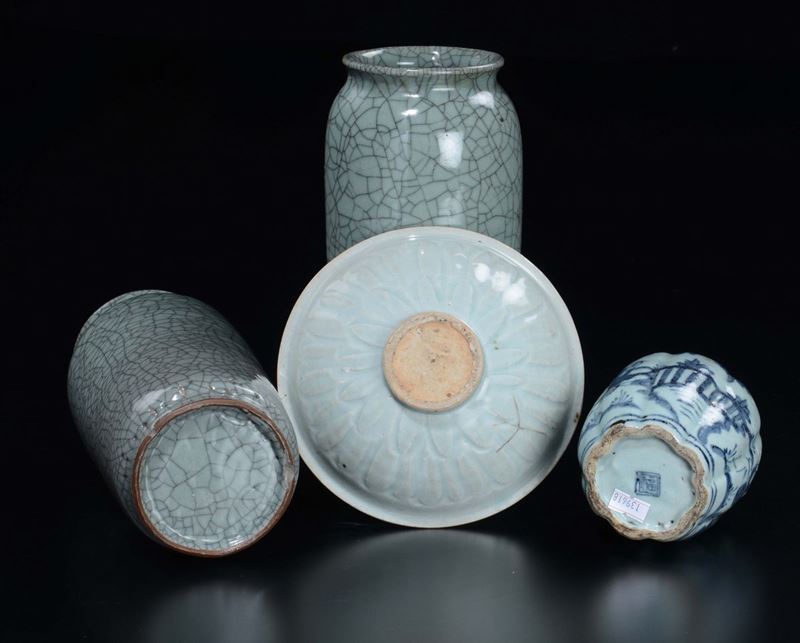 Lotto di oggetti in porcellana, coppia di vasi craquelè, una ciotola ed un vasetto con personaggi, Cina, XX secolo