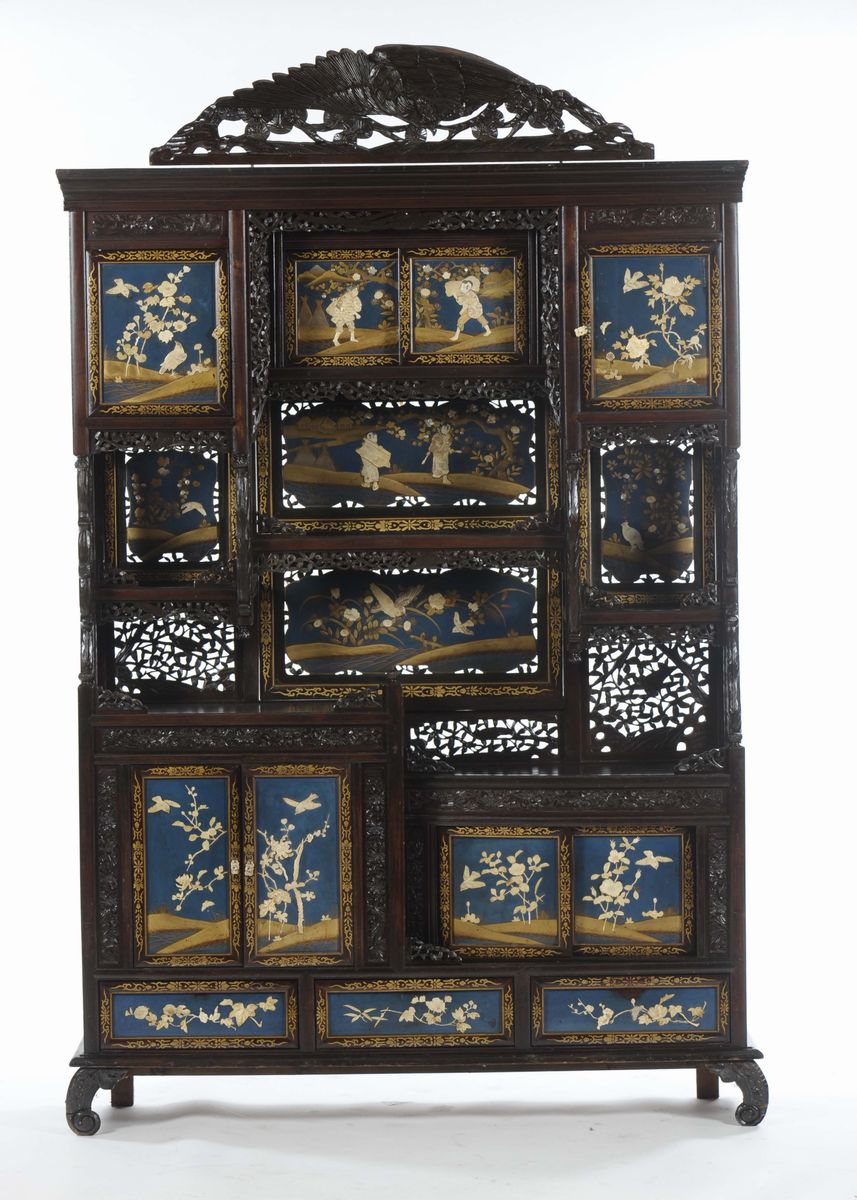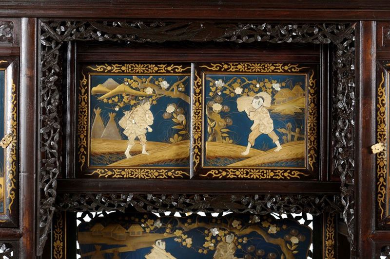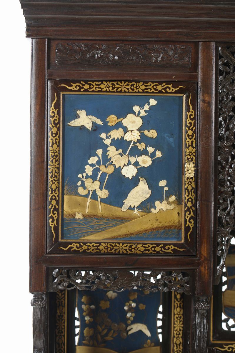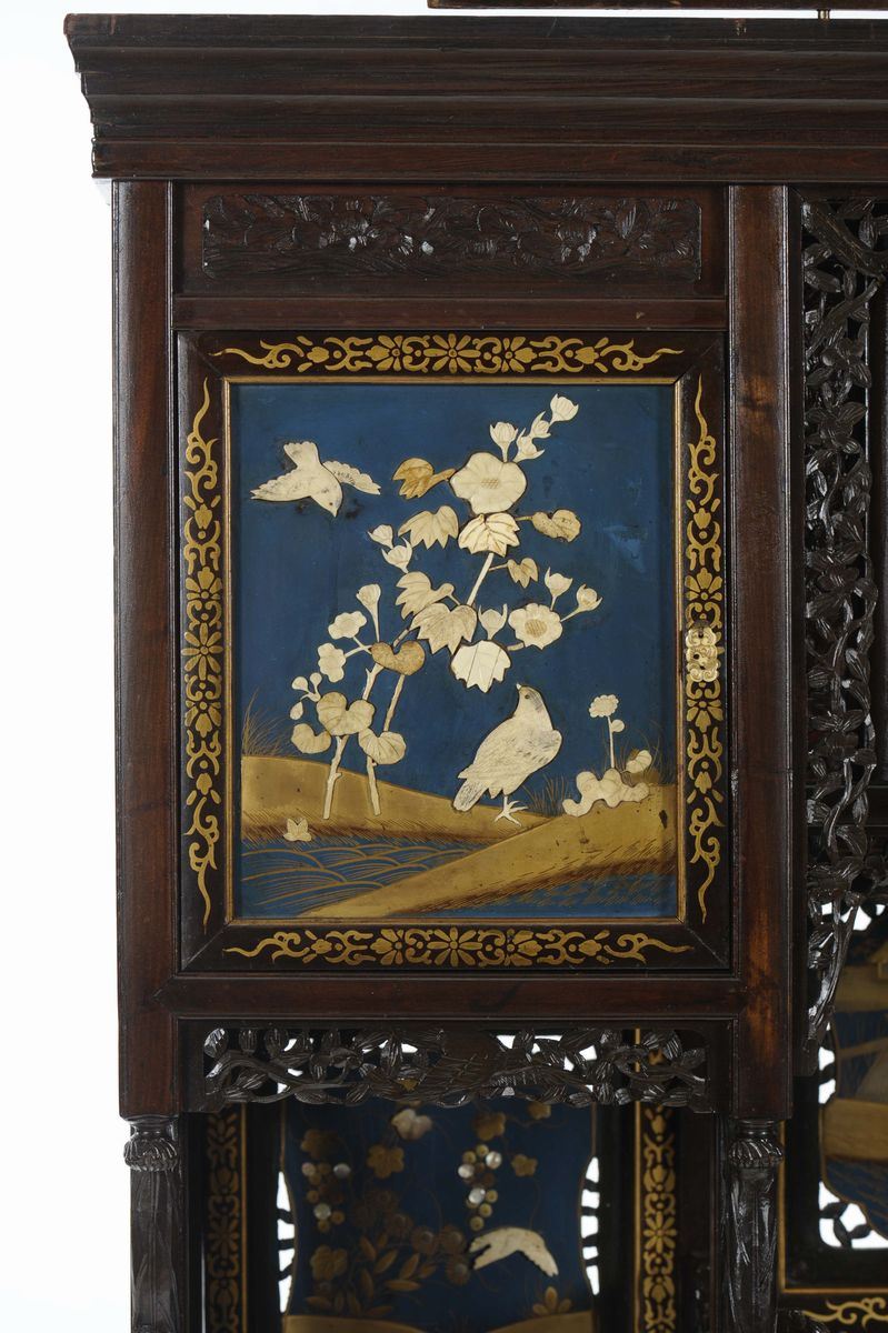 Mobile in legno laccato, lavorato e traforato con riquadri con scene naturalistiche e di vita comune, Giappone, inizio XX [..]