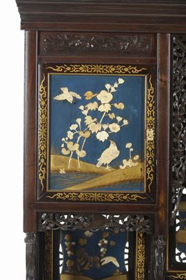 Mobile in legno laccato, lavorato e traforato con riquadri con scene naturalistiche e di vita comune, Giappone, inizio XX secolo