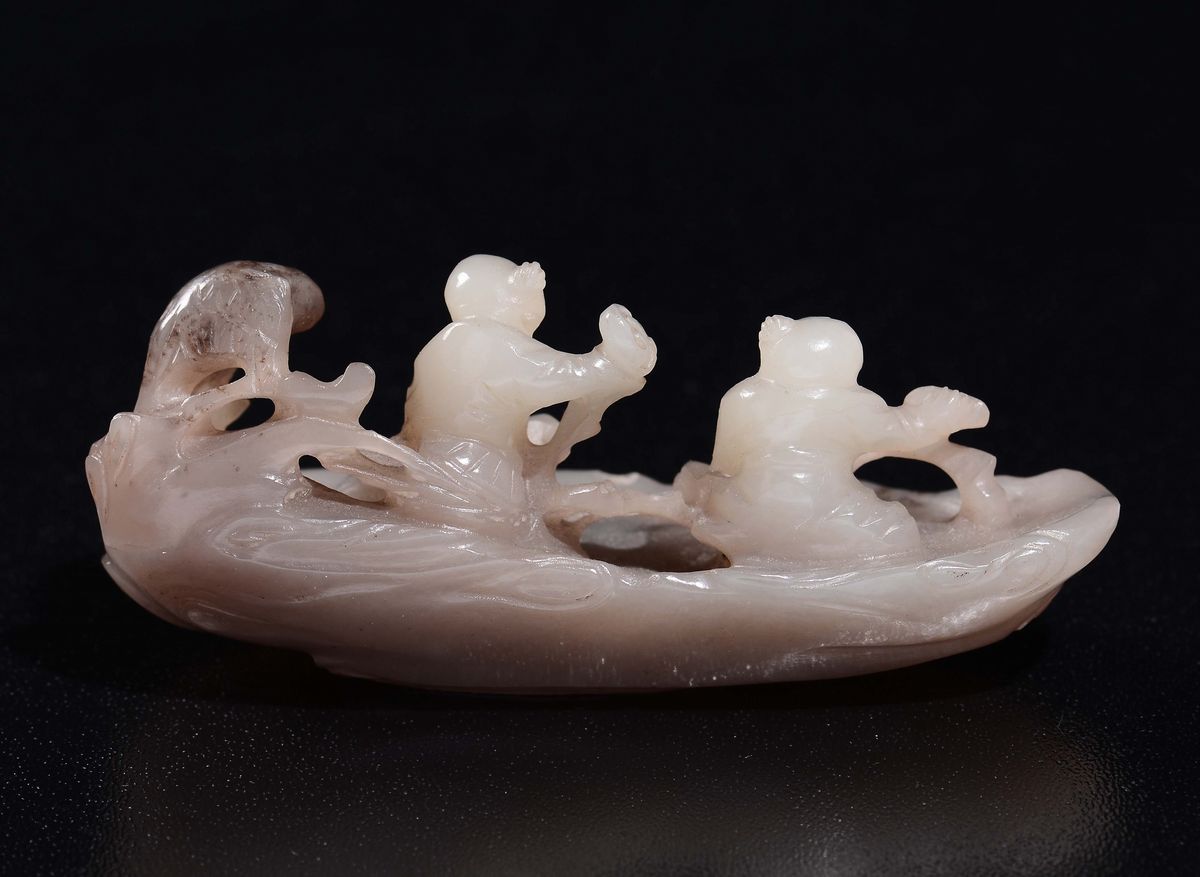 Piccola barca con pescatori e falco scolpita in giada bianca e russet, Cina, Dinastia Qing, XIX secolo
