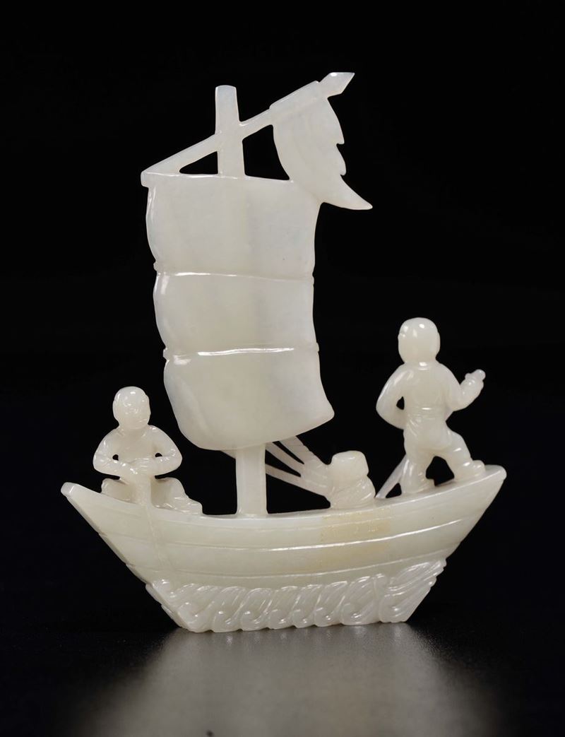 Piccola barca con pescatori scolpita in giada bianca, Cina, Dinastia Qing, XIX secolo