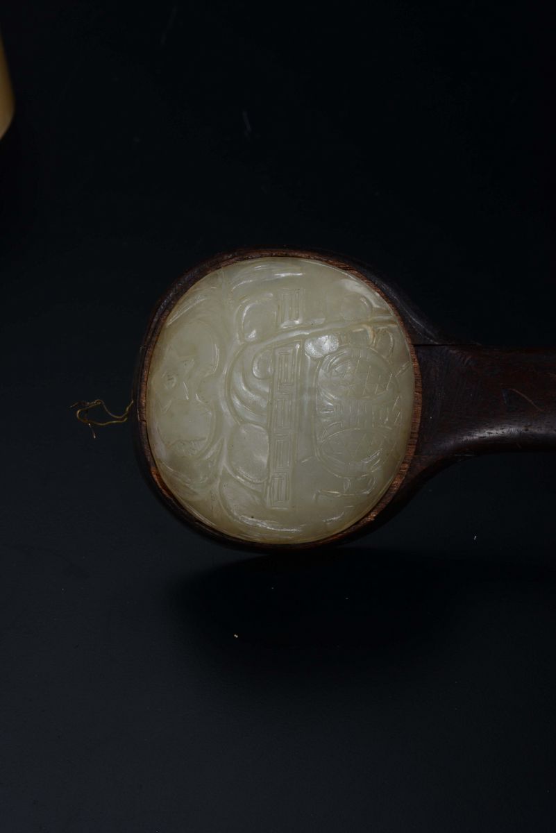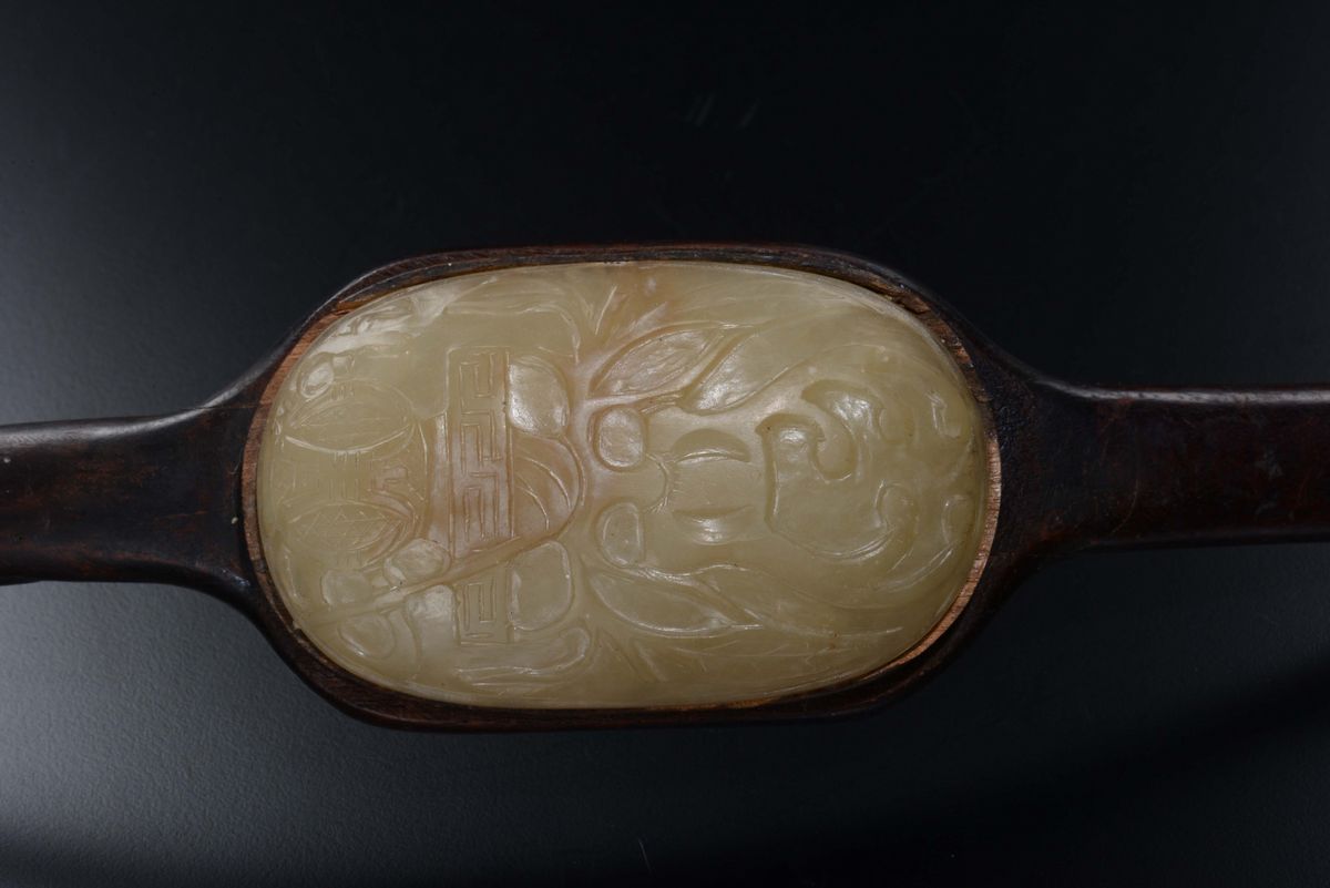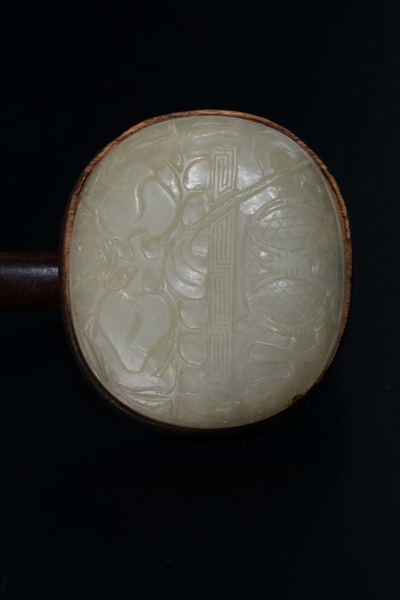 Ruyi in legno con placche in giada bianca e russet scolpite a decoro naturalistico, Cina, Dinastia Qing, XIX secolo