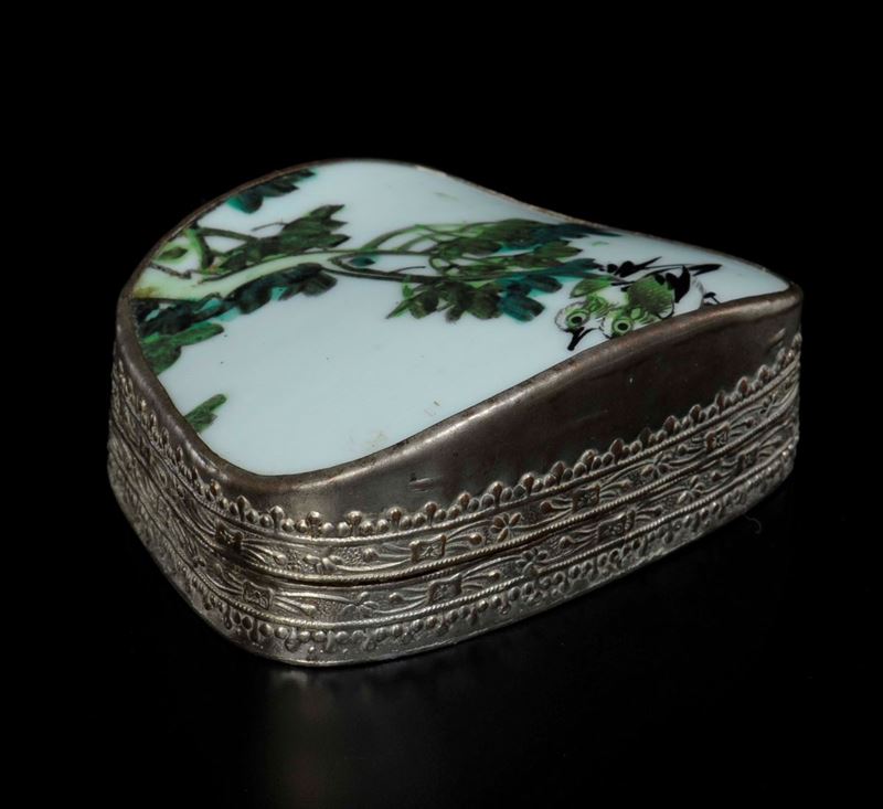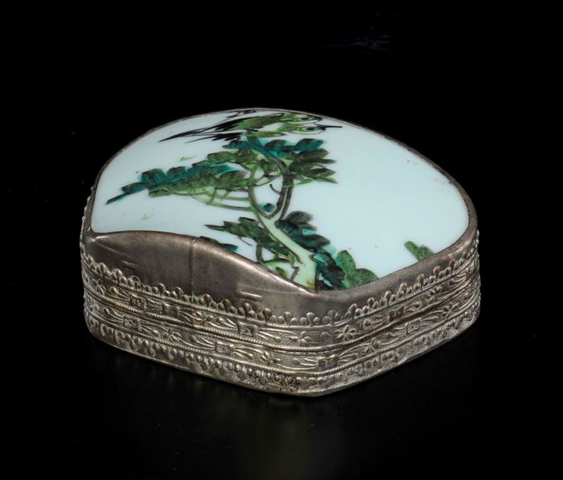 Scatola con coperchio in argento e porcellana smaltata con decoro di due uccellini posati su un ramo, Cina, Dinastia Qing, [..]