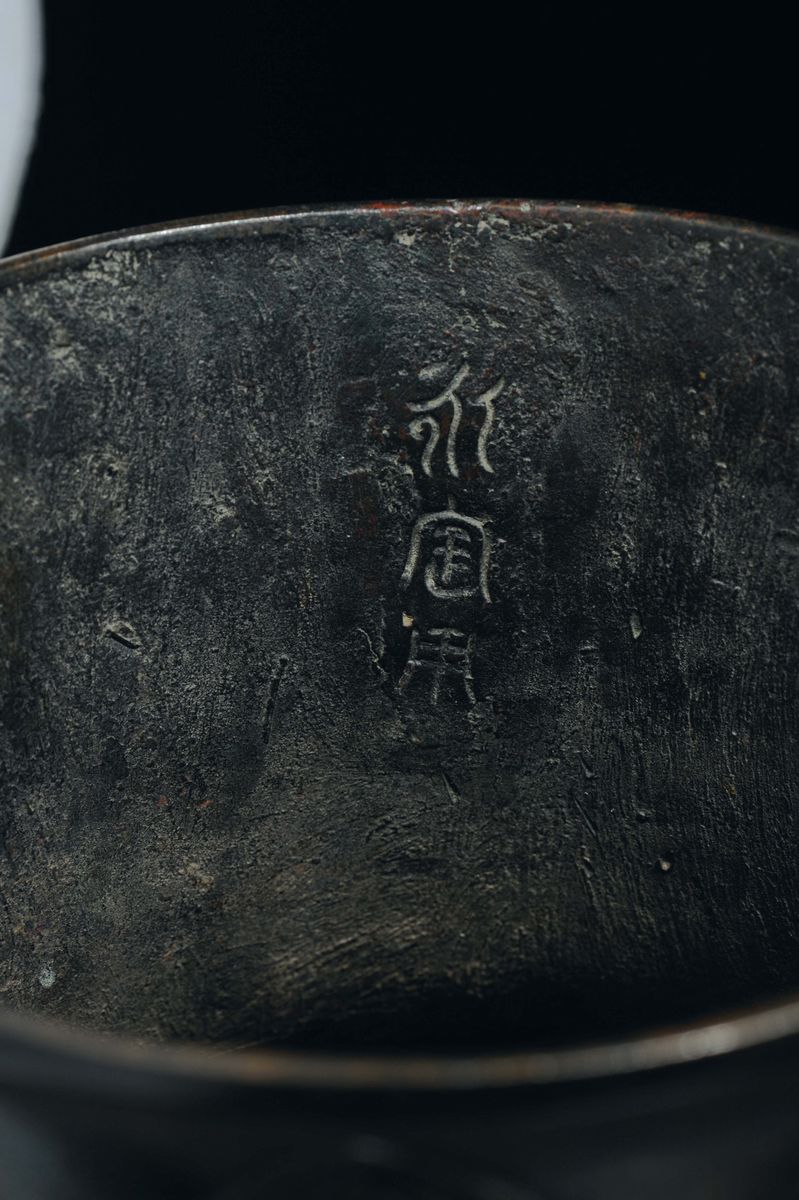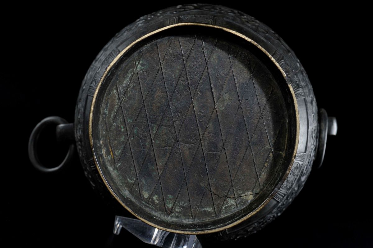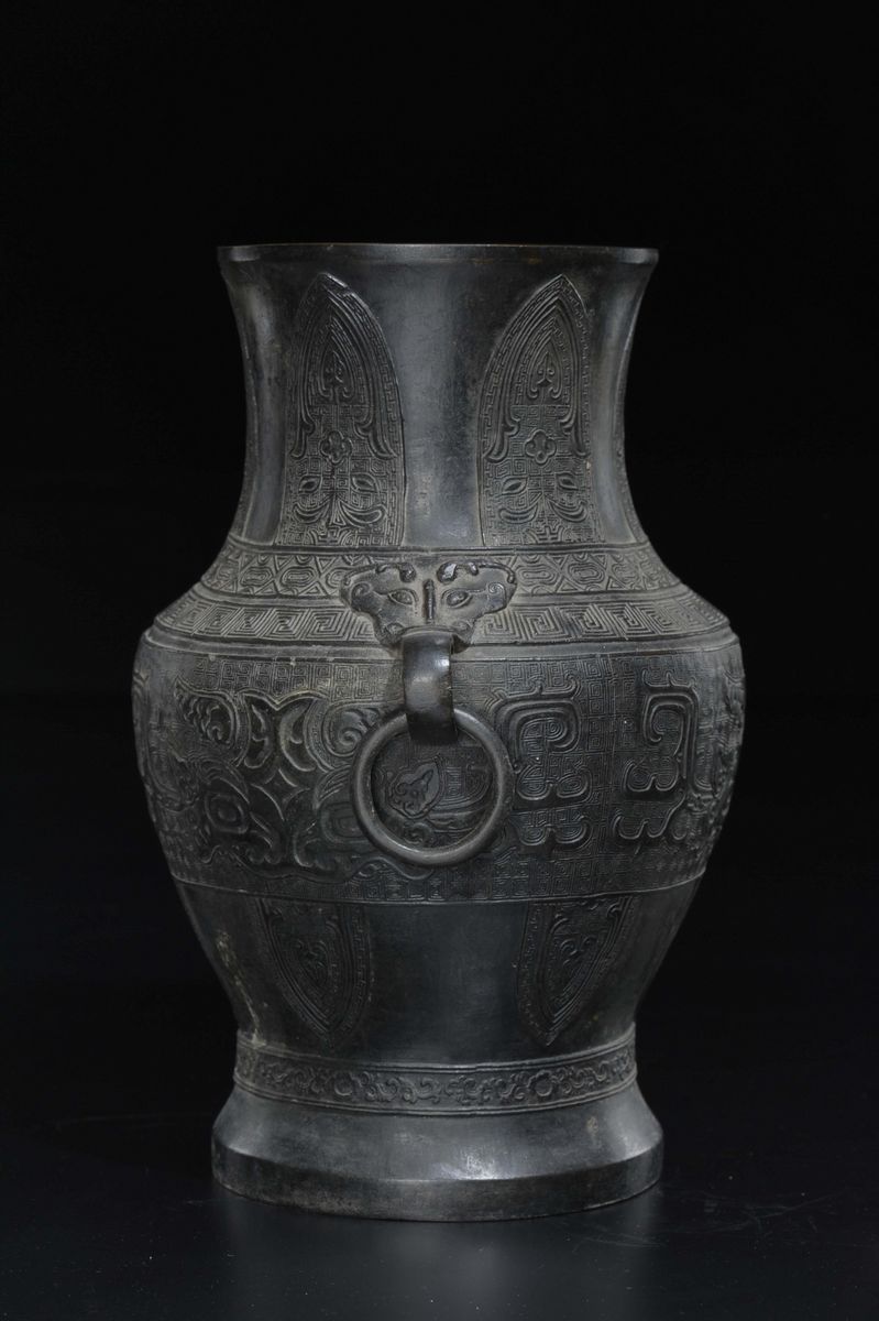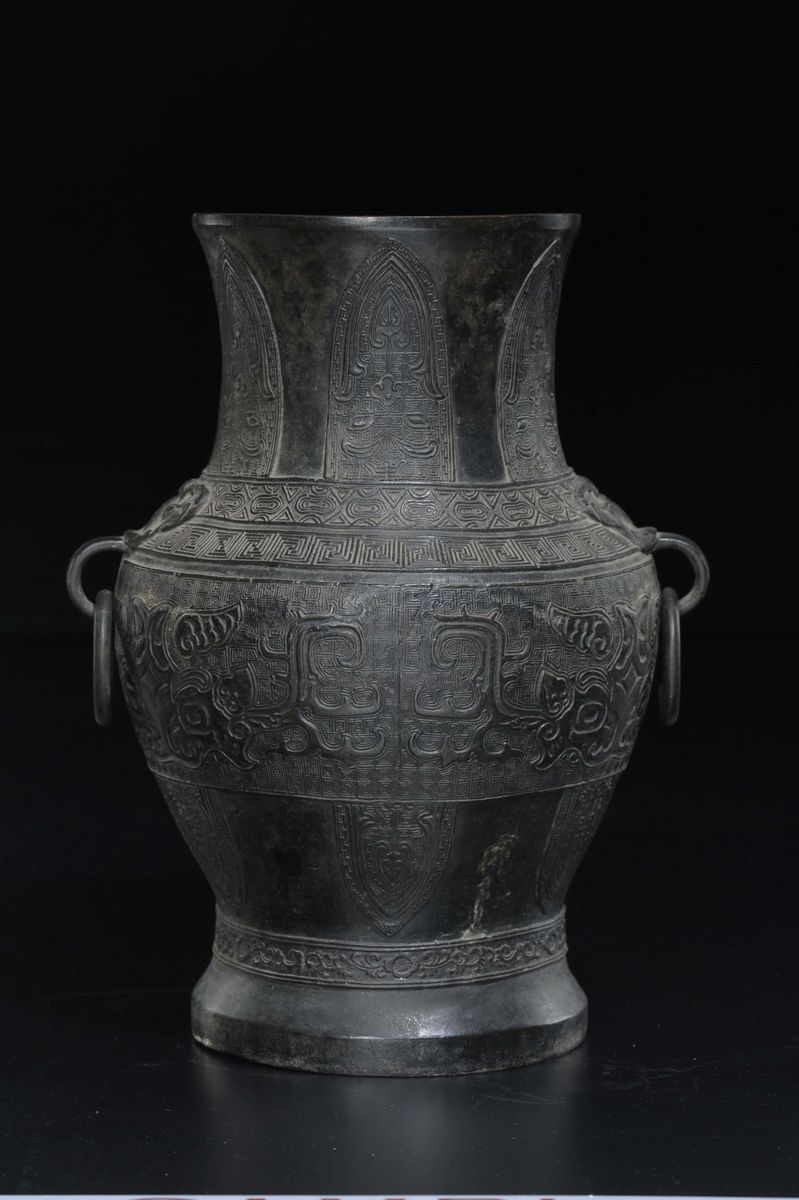 Vaso con manici ad anelli in bronzo sbalzato a decoro geometrico d'ispirazione arcaica, Cina, Dinastia Ming, XVII secolo