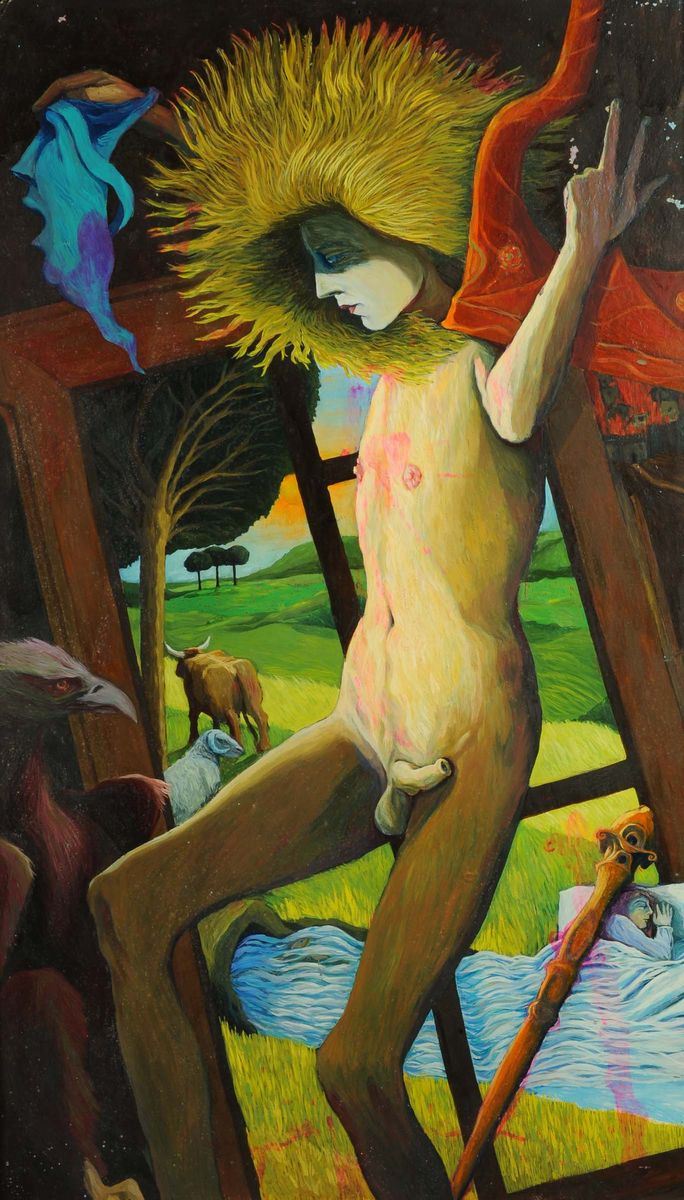 olio su tavola dipinto fronte e retro, cm 155x96