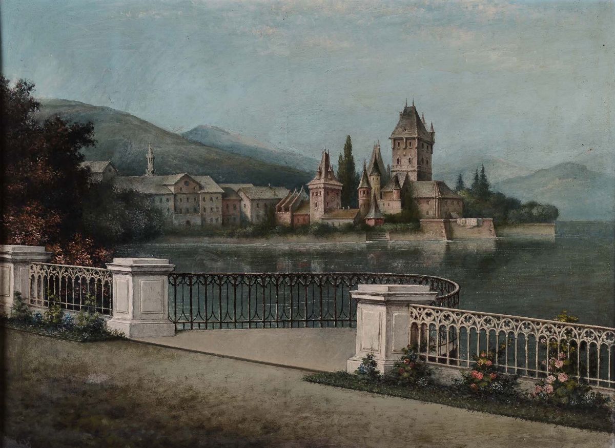 Anonimo del XIX secolo Paesaggio lacustre Paesaggio lacustre con barche di pescatori