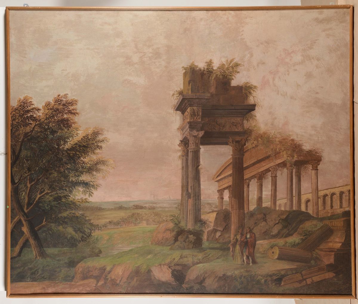 Anonimo del XIX secolo Capriccio architettonico con rovine, acquedotto sullo sfondo e figure