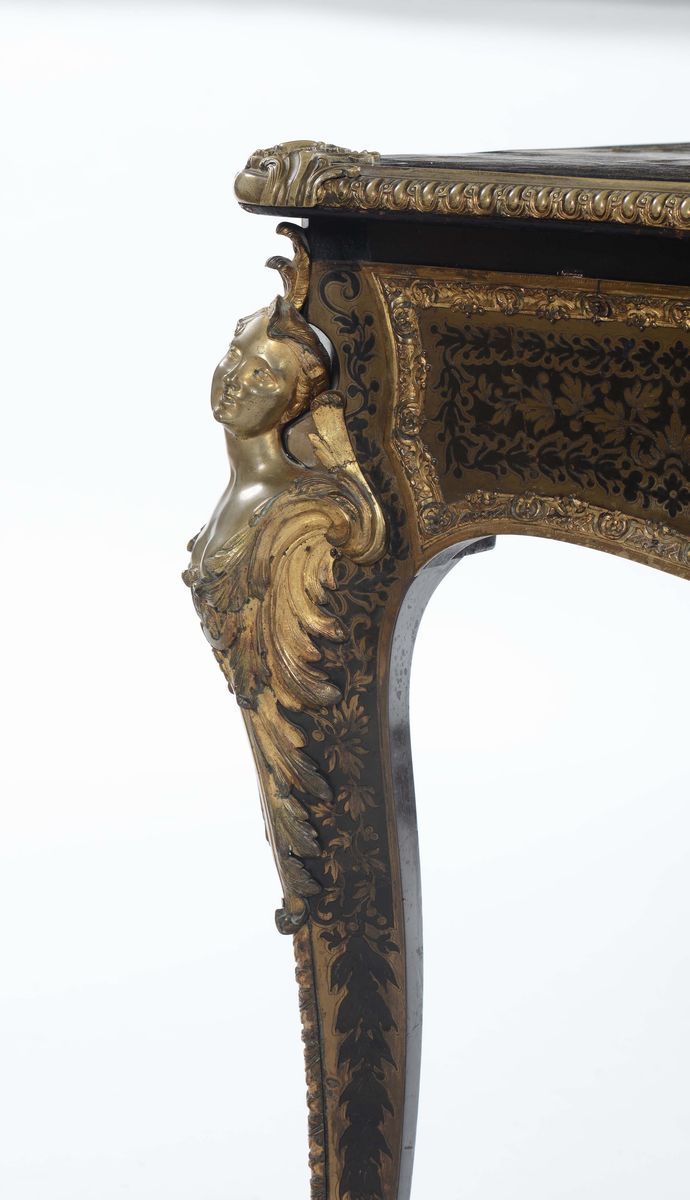tre cassetti sulla fascia centrati da volto di Bacco da cui si dipartono elementi di uva e vite in bronzo dorato, fasce modanate, gambe mosse con figure femminili in bronzo dorato all'innesto, piedi a ricciolo. Piano in pelle, fasce e gambe decorati da un intarsio a motivo fogliaceo, cm 157x85x77