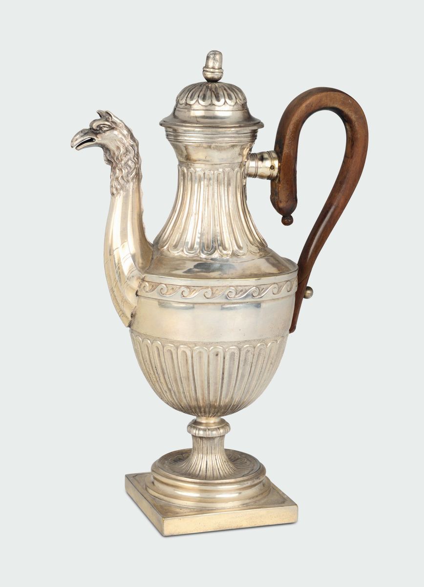 manico in legno intagliato. Tipico esempio dell'argenteria romana neoclassica; corpo a vaso decorato con costolature verticali e fascia a greca; elegante beccuccio a testa di grifone, gr. 580, altezza cm 28