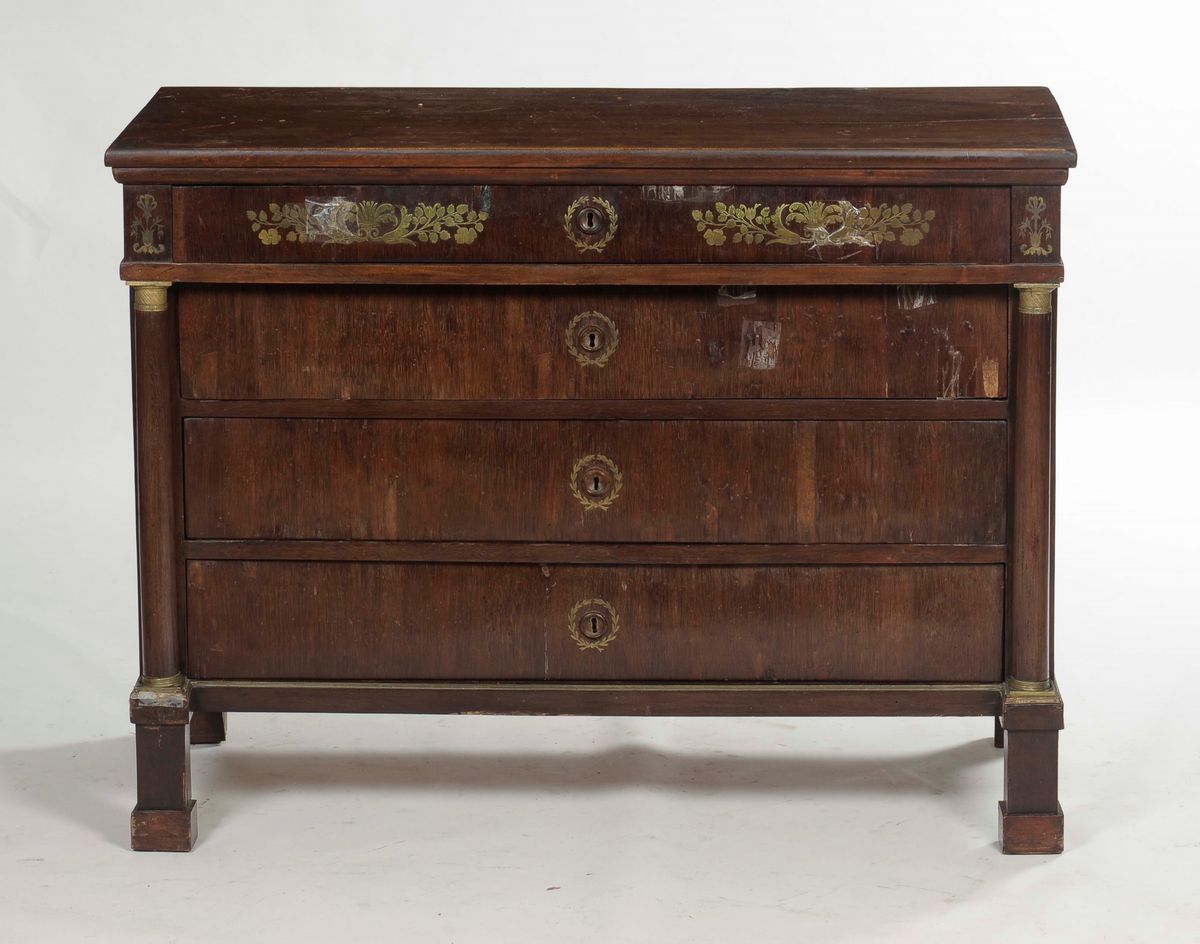 fronte a tre cassetti più uno sotto il piano, colonne sui montanti con capitelli dorati, cm 125x59x94