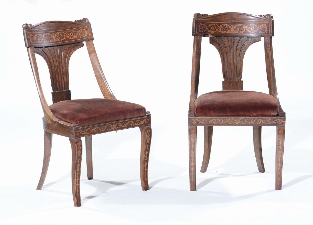 Comodino in stile Luigi XVI e due sedie intarsiate