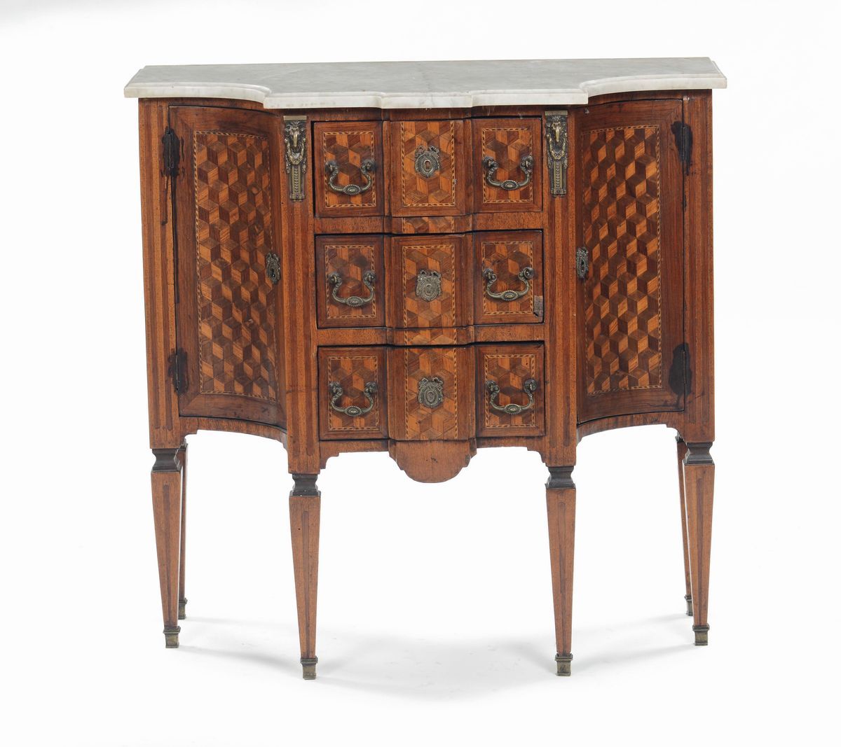 Comoncino scantonato lastronato ed intarsiato, XIX secolo