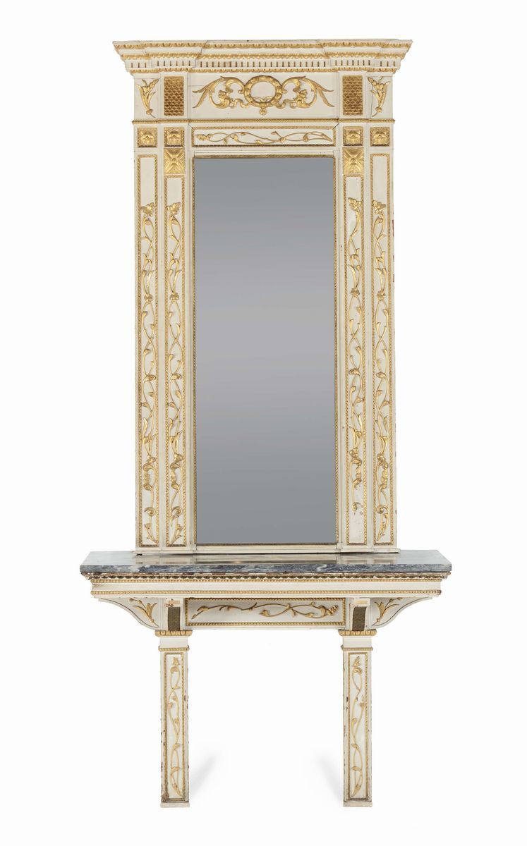 Console con specchiera Luigi XVI in legno intagliato, laccato e dorato, Genova XVIII-XIX secolo