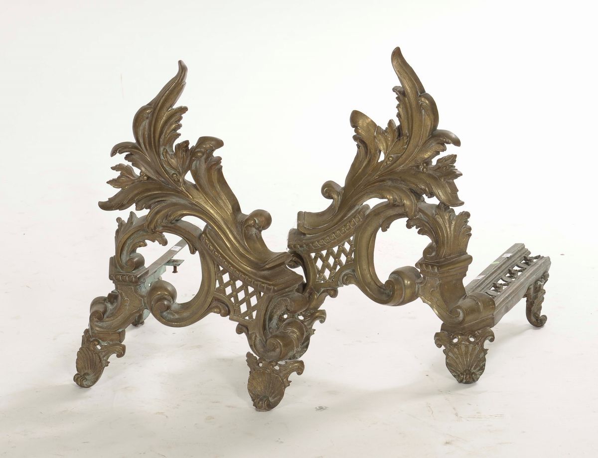 Coppia di alari a volute in bronzo dorato, inizio XX secolo