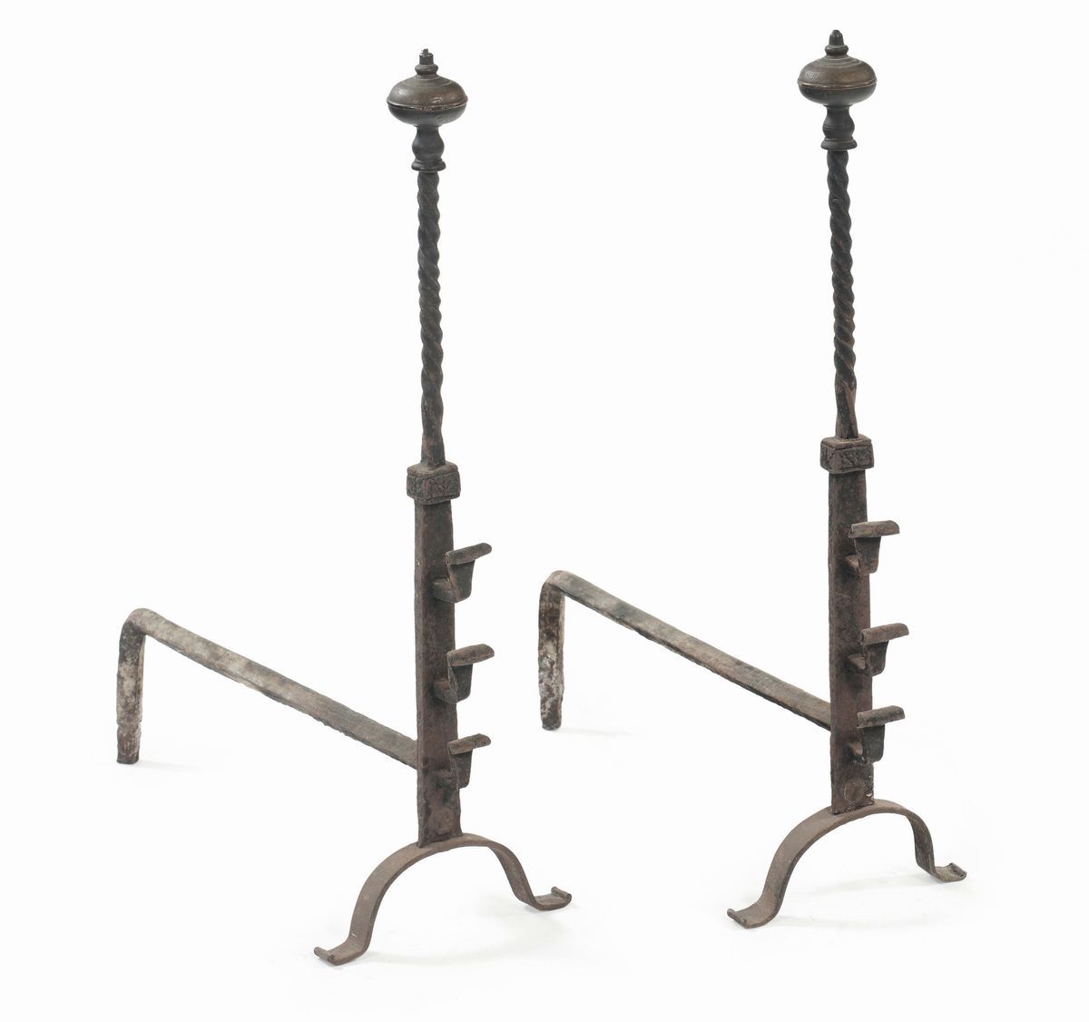 Coppia di alari in ferro battuto, XVII-XVIII secolo