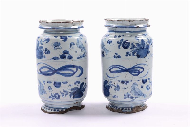 Coppia di albarelli di farmacia in maiolica con decoro “a tappezzeria”, Savona XVII secolo