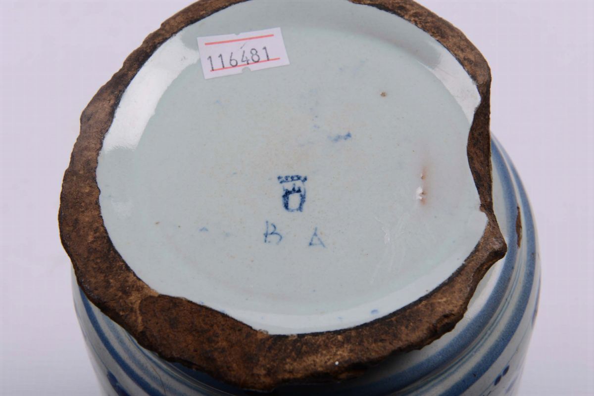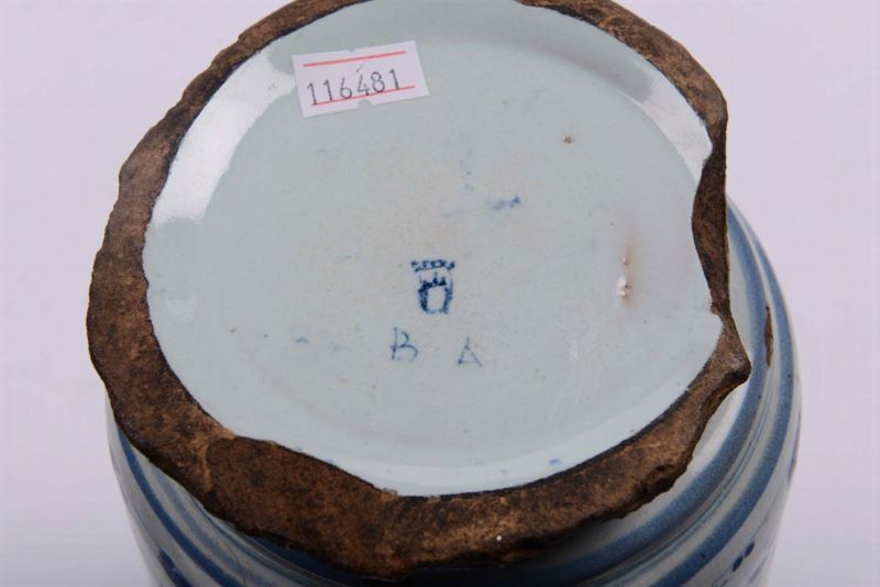 decoro in monocromia blu su fondo azzurro raffigurante elementi vegetali, fiori e animaletti; al centro si trovano i cartigli epigrafici dei rispettivi unguenti, marca Stemma e lettere BA, altezza cm 22 (restauri, sbeccature e difetti allo smalto)