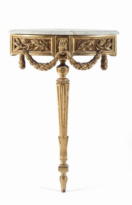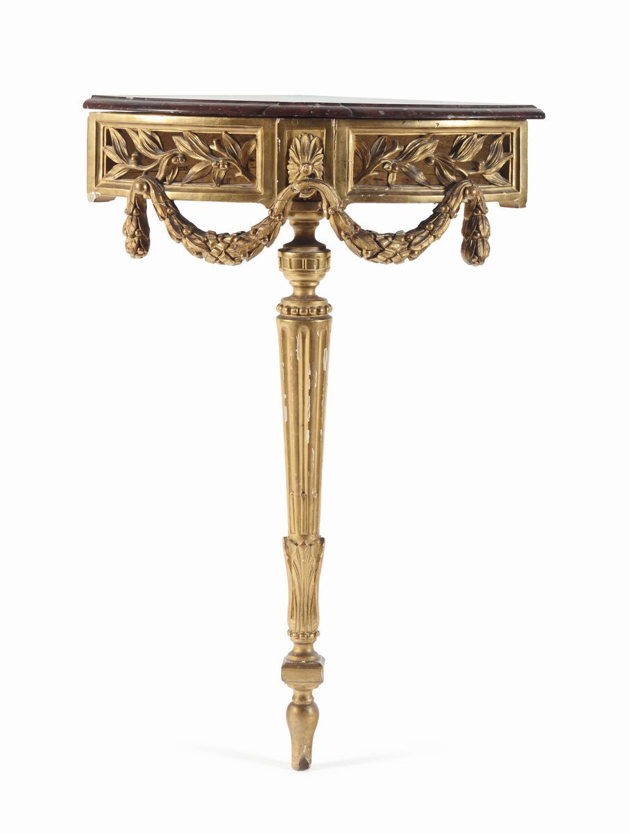 fascia intagliata a motivo vegetale con festoni, gamba troncoconica scanalata, piano in marmo rosso, cm 54x39x82
