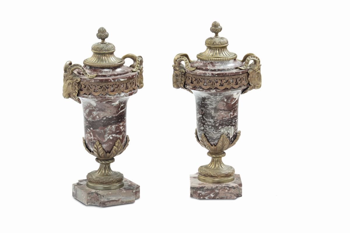 Coppia di cassolettes in marmo e bronzo dorato, XIX secolo