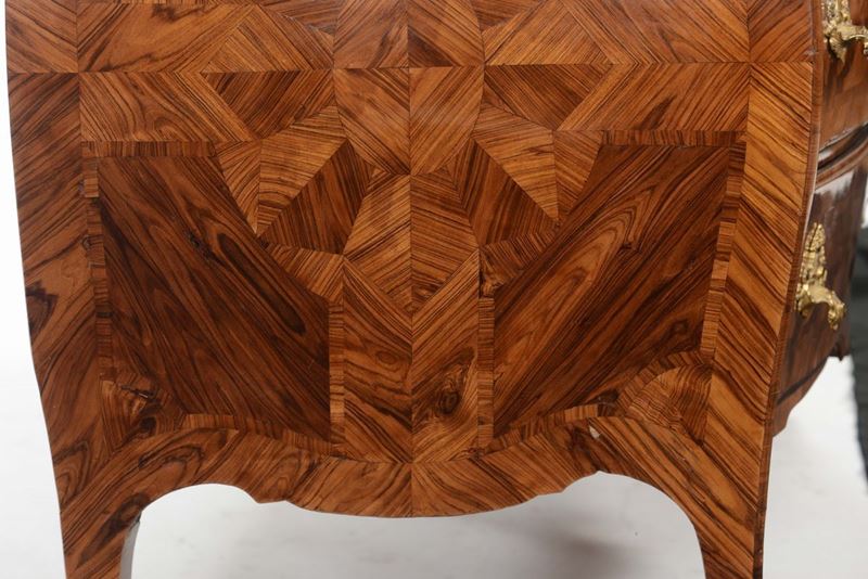 Coppia di commodes a tre cassetti interamente lastronate in bois de violette, seconda metà XVIII secolo