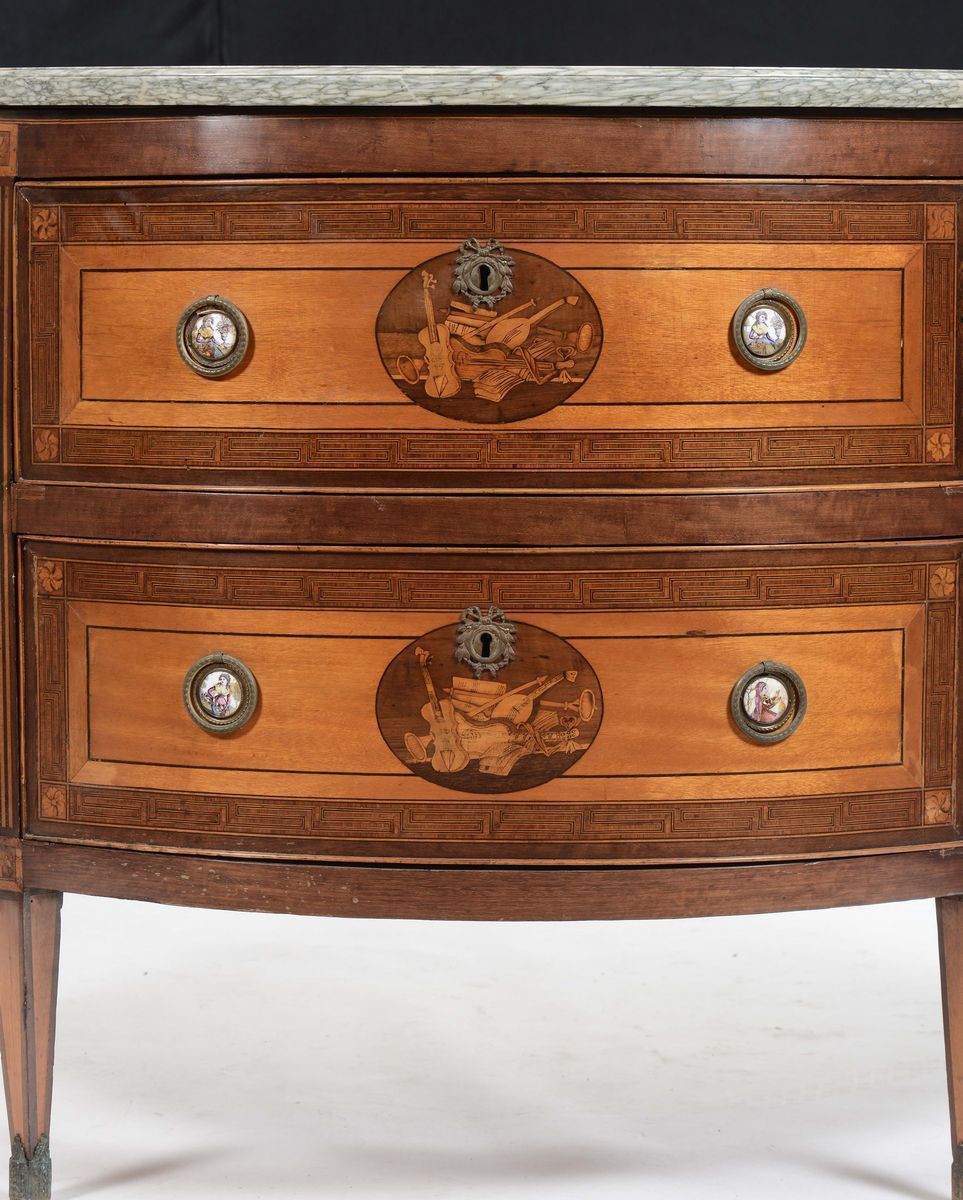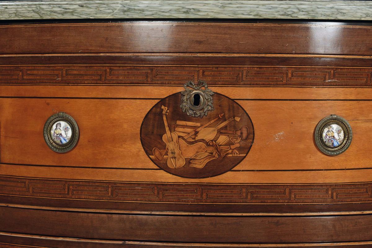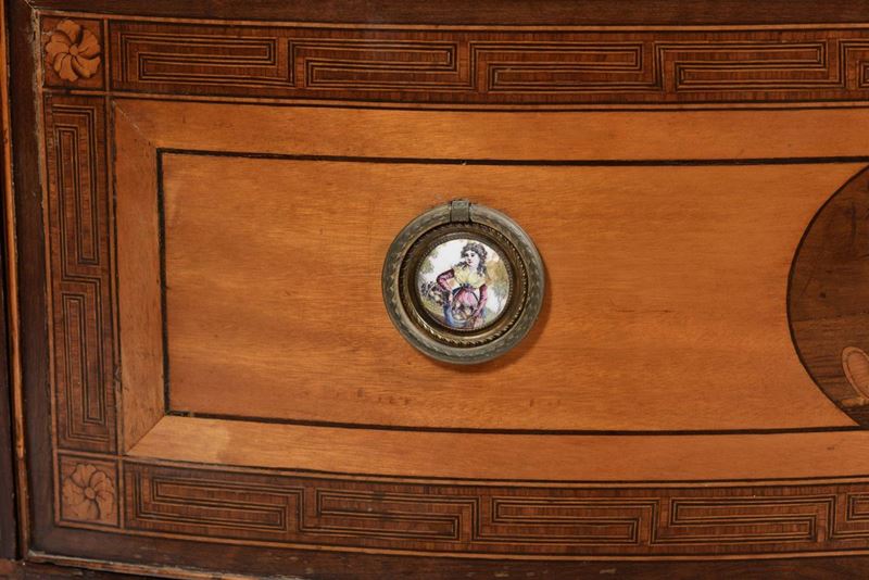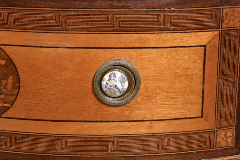 due cassetti sul fronte con decoro centrale intarsiato con strumenti musicali, maniglie in bronzo dorato con porcellana policroma entrale, piani in marmo, cm 135x65x96