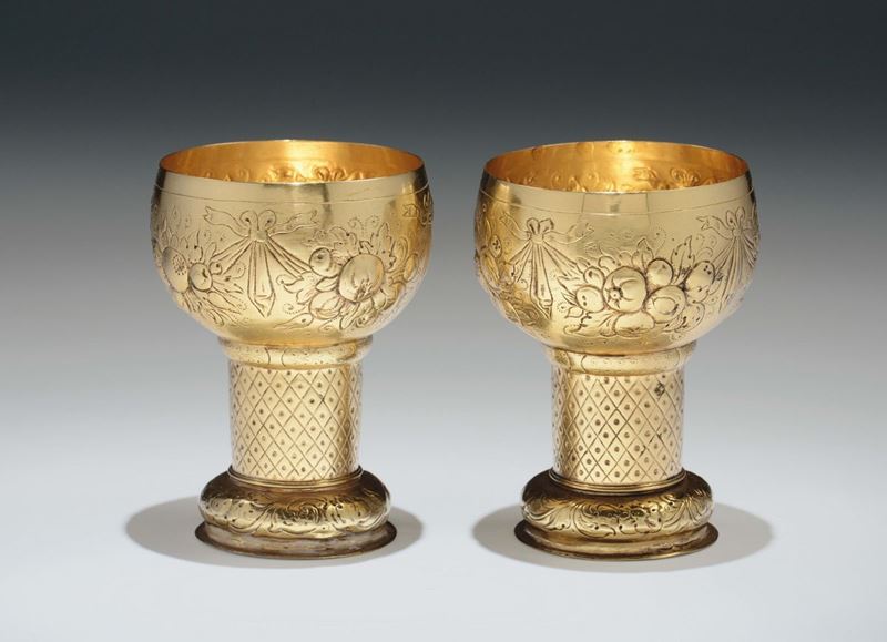 Coppia di coppe in argento vermeille sbalzato, Germania o Olanda XVIII-XIX secolo
