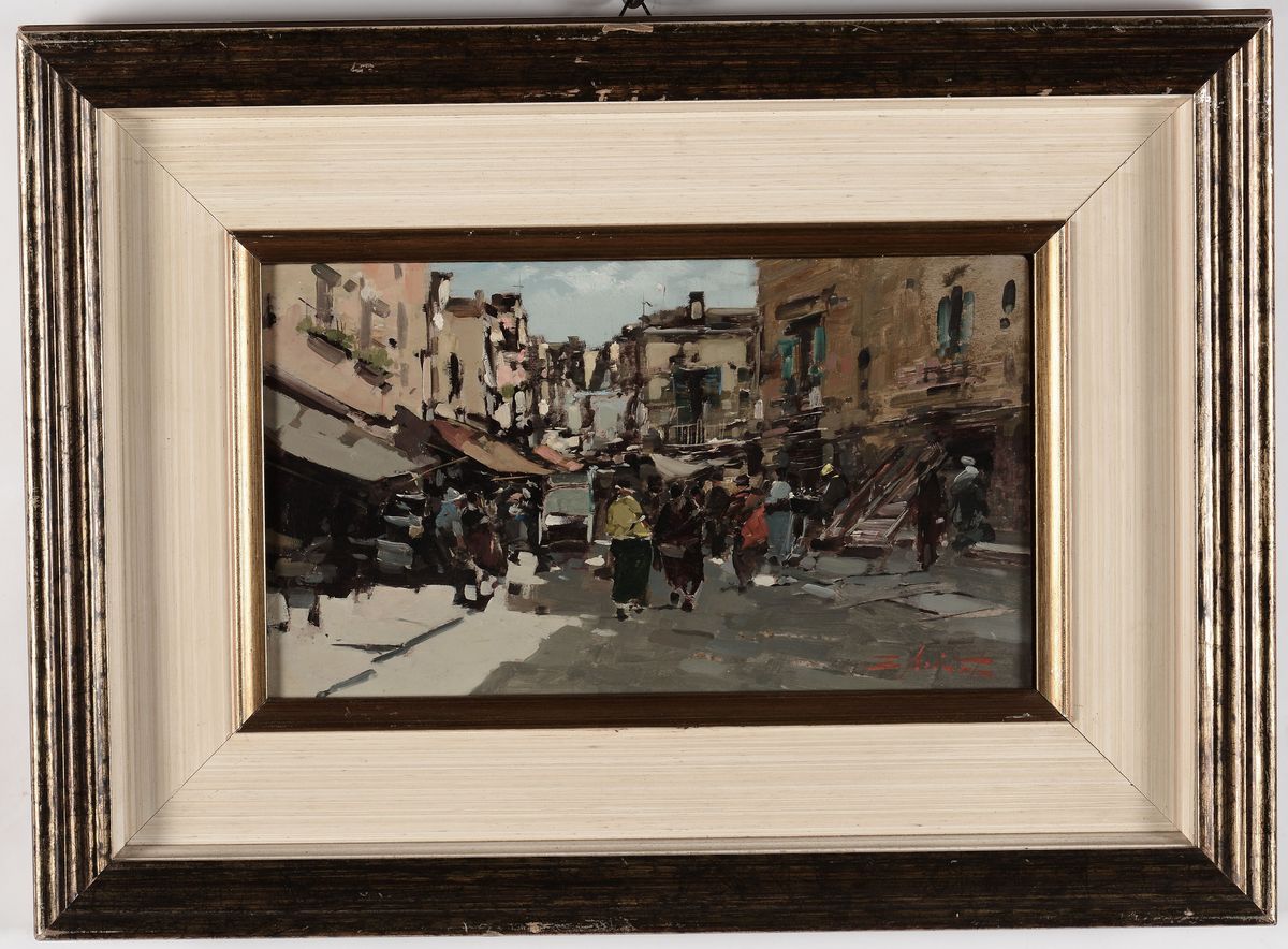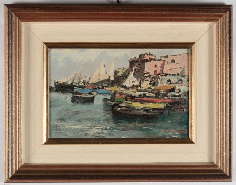 Coppia di dipinti a firma Briante Veduta di porticciolo Veduta cittadina