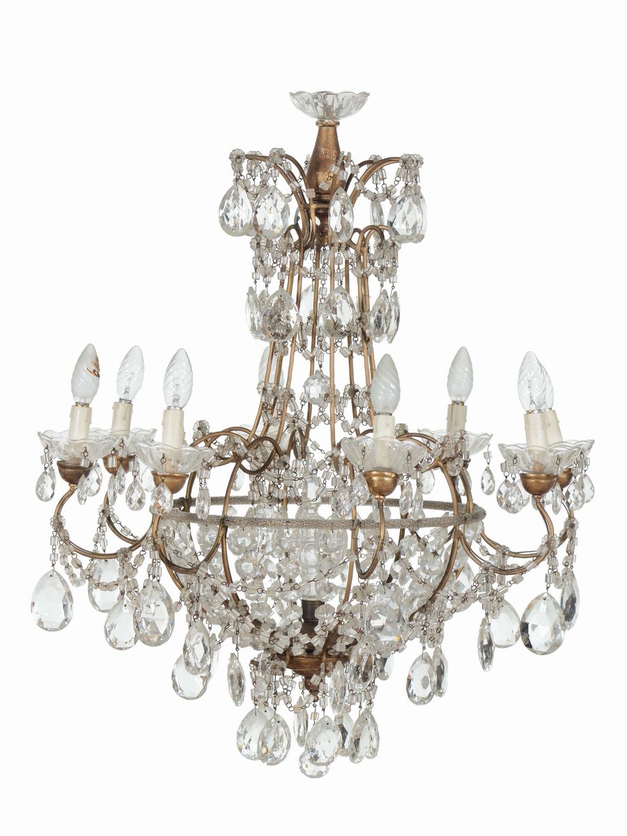 Coppia di lampadari a otto luci in metallo e cristallo, XIX secolo