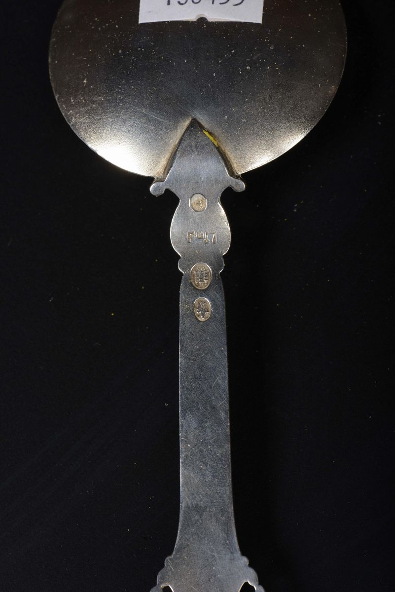 - cucchiaio con manico terminante a giglio stilizzato, argentiere CF, Copenaghen 1923- cucchiaio con manico decorato a volute, argentiere Carl Peters, Copenaghen 1870, fatto nel laboratorio di Vilhelm Cristensen.- piccolo mestolo, argentiere CF, Copenaghen 1911- cucchiaio commemorativo con ricco manico coronato e profilo regale sul cavetto, Copenaghen 1905- cucchiaio con manico a torchon, argentiere LB, Copenaghen 1902 - piccolo mestolo, punzone di Aalborg, Hans Busch 1766-1780?