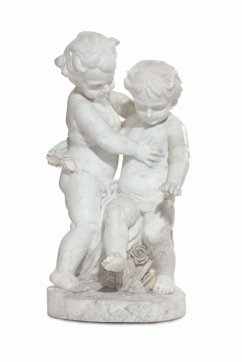 Gruppo in marmo bianco raffigurante due puttini, XIX secolo