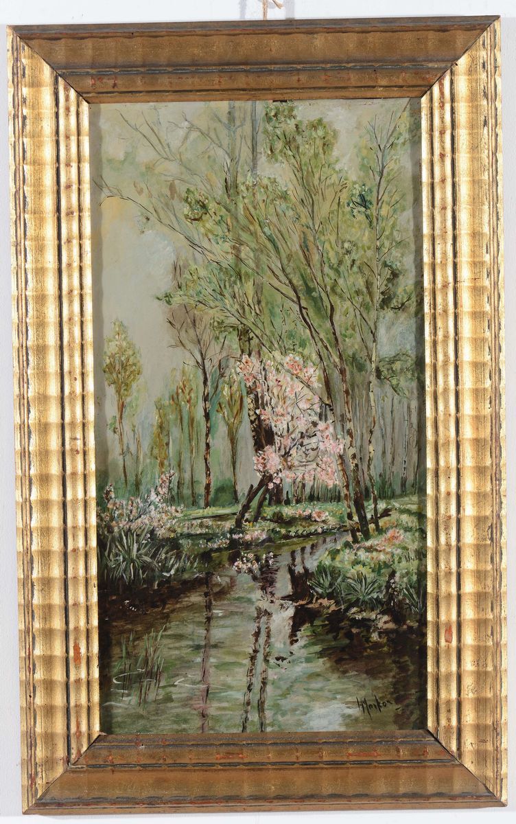 coppia di paesaggi lacustri, olio su cartone, cm 61x33, firmati in basso a destra