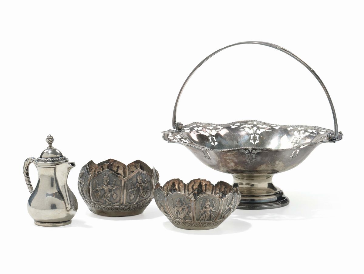 Lotto composto da un cestino in argento, una brocchetta e due cestini di fattura indiana