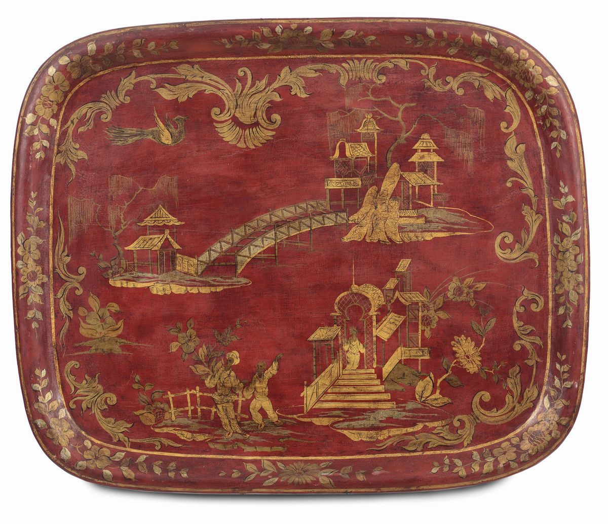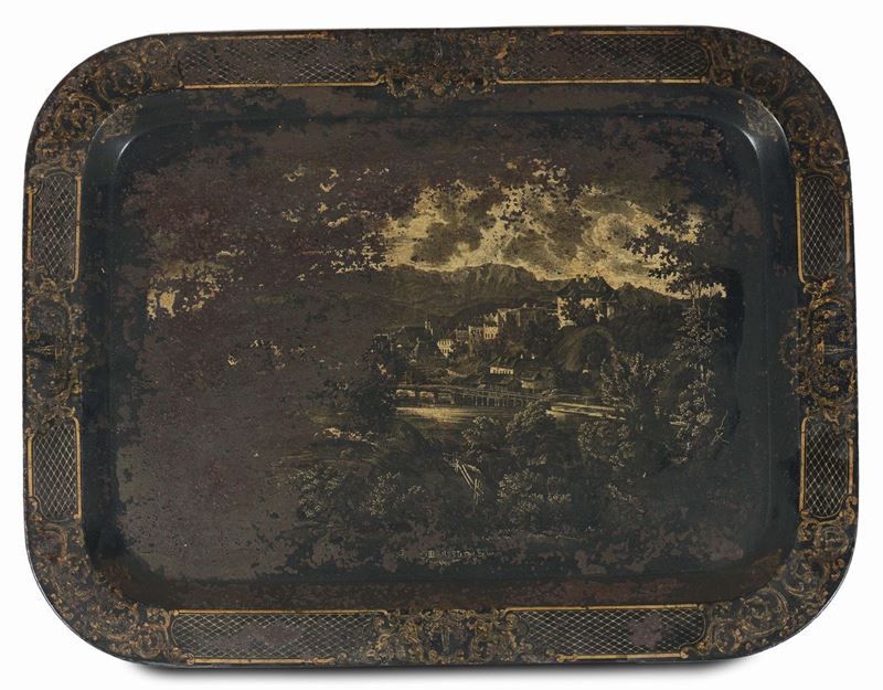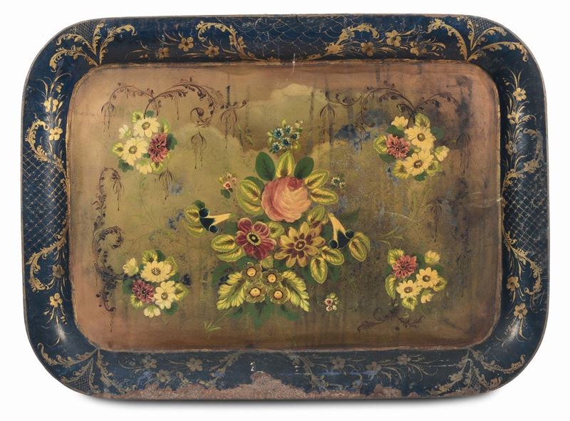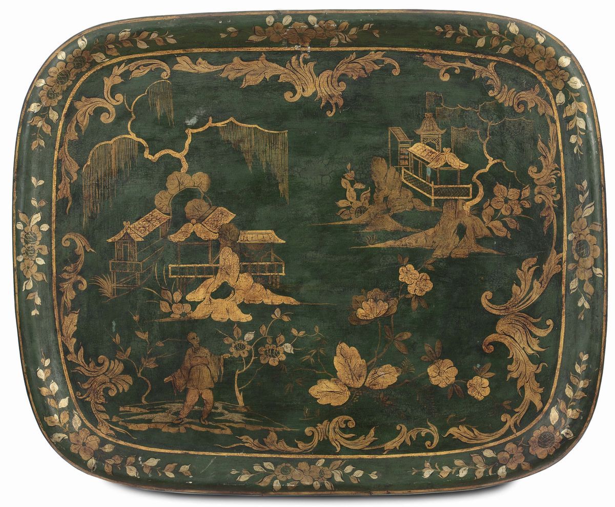 Lotto di cinque vassoi laccati in metallo laccato, XVIII-XIX secolo