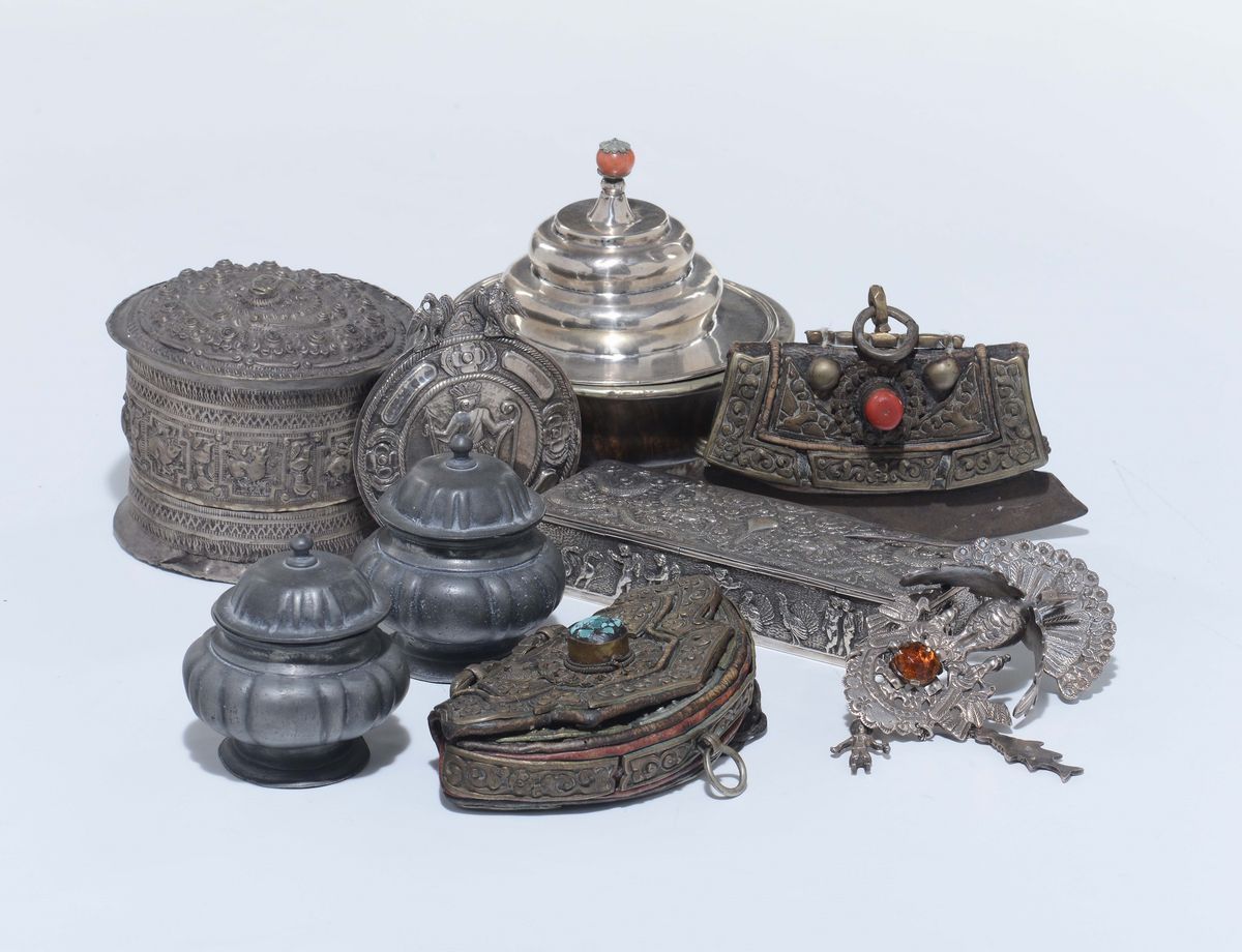 tra cui due borsette indiane, scatola con coperchio in argento? e due vasetti in peltro e altro