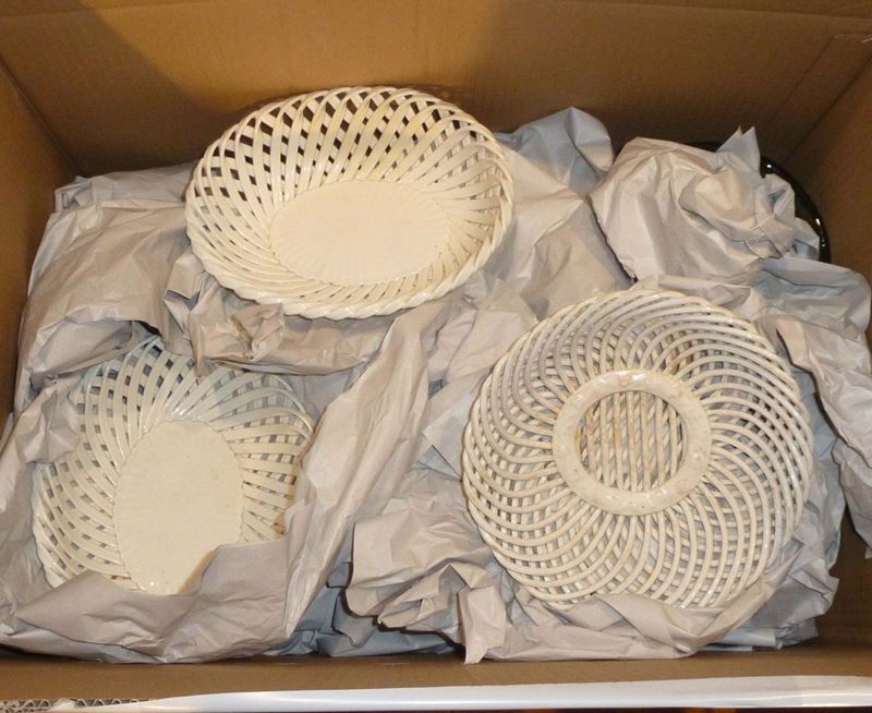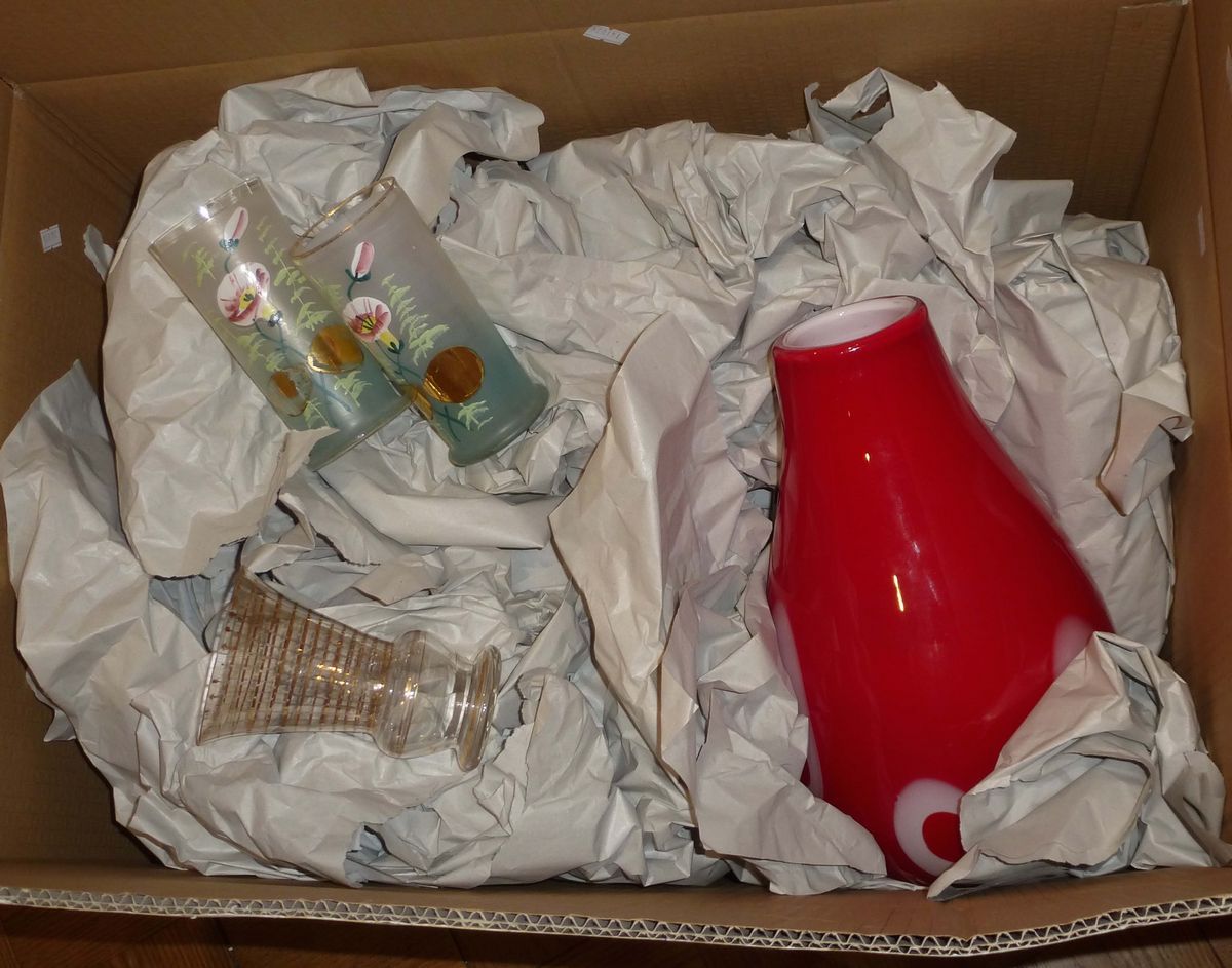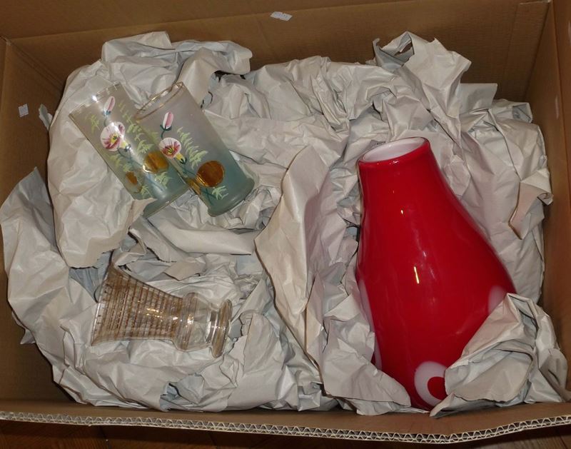 Lotto di oggetti in vetro tra cui vasi e oggetti in terraglia bianca