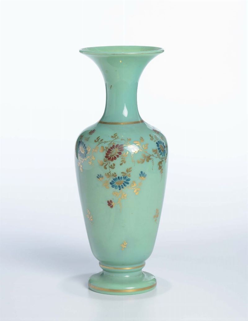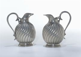 coppia di caraffe in peltro, h cm 21, vaso vetro verde opaline, h cm 30, piatto grande in terracotta smaltata, tre ciotole colorate esagonali in porcellana, Cina