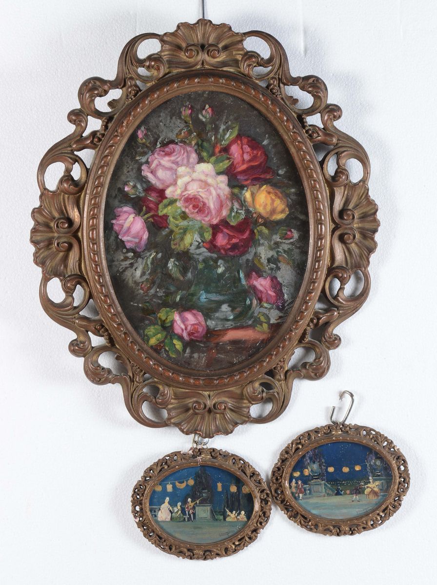 una natura morta floreale e due piccoli dipinti ovali firmati, cm 38x28 e cm 11,5x15