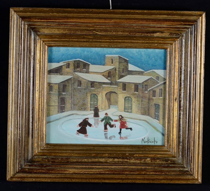 coppia di olii su tavola, cm 22x26,5, firmati Norberto