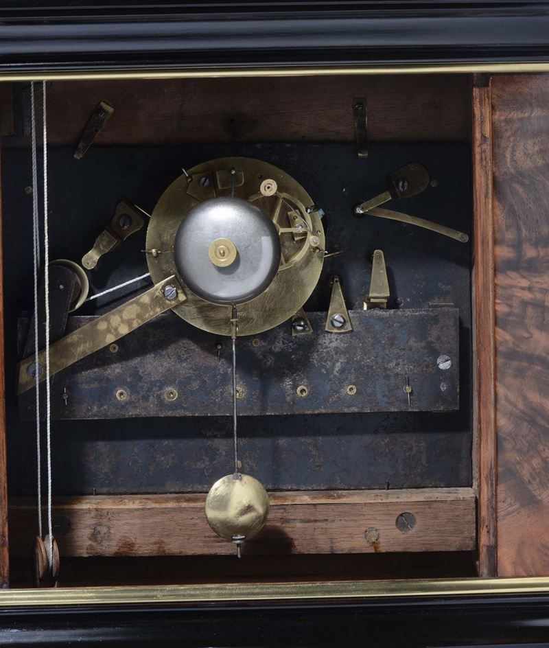 cassa in legno lastronato in radica di noce e bronzi dorati. Scappamento ad ancora piccola a peso, suoneria a molla delle ore e mezz’ore, cm 53x43x23