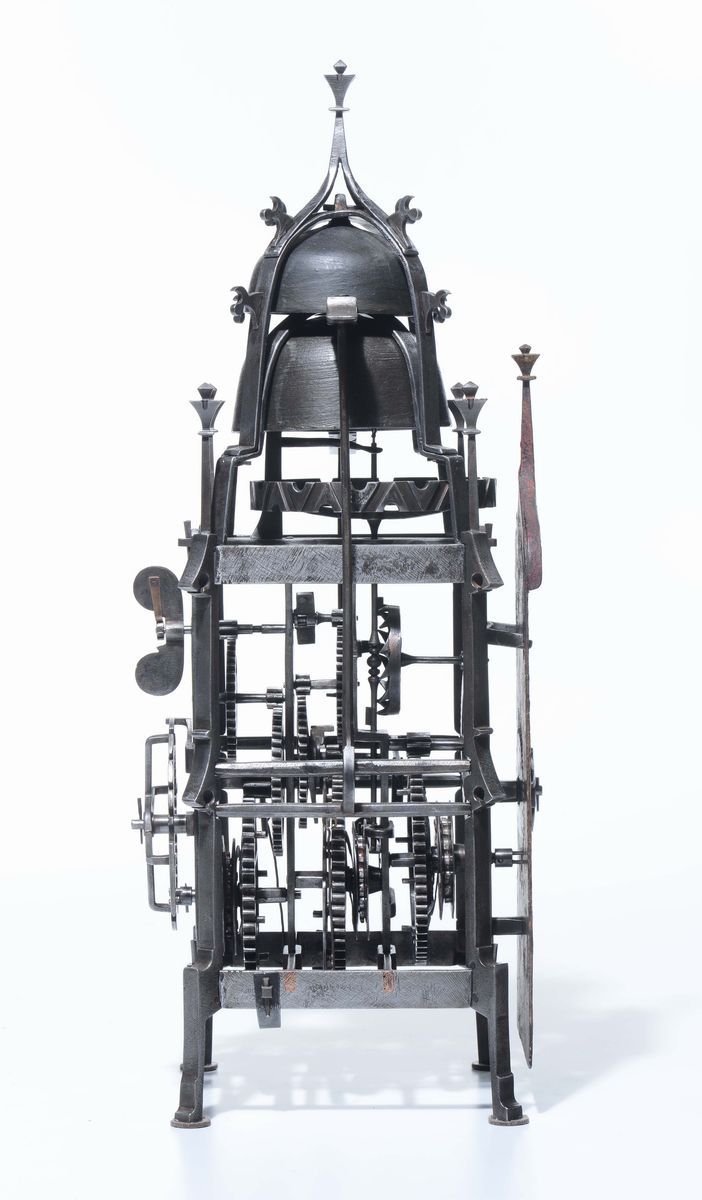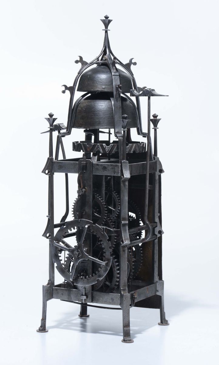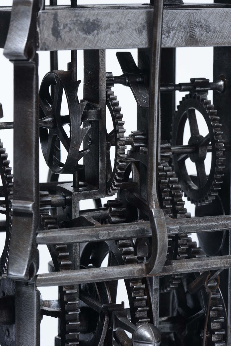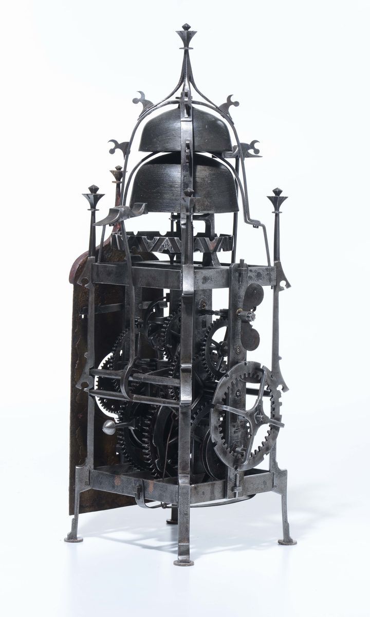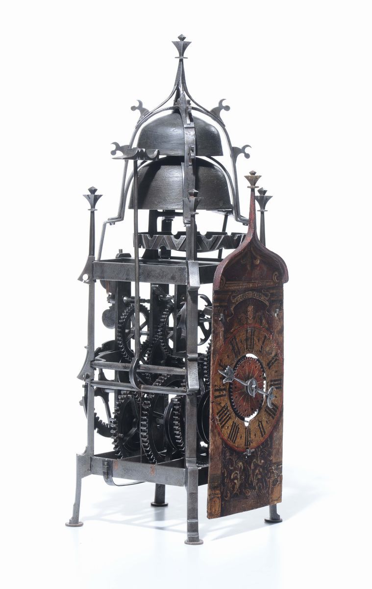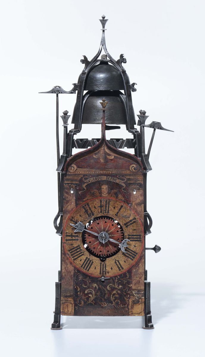 Orologio gotico in ferro battuto e quadrante in lamiera dipinta e dorato. Probabilmente Wihterthur, Svizzera