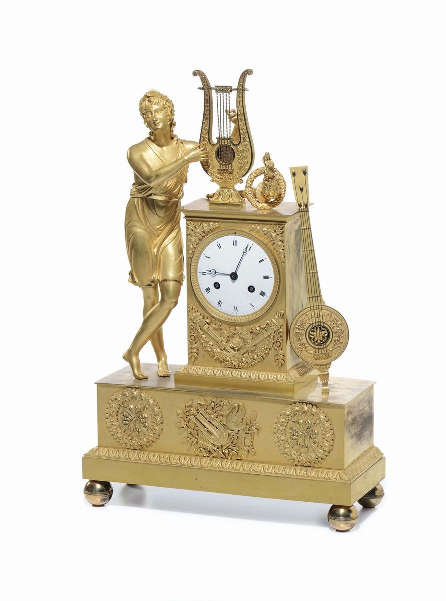 quadrante smaltato con numerazione romana affiancato da suonatore di lira a tuttotondo, cm 34x14x54