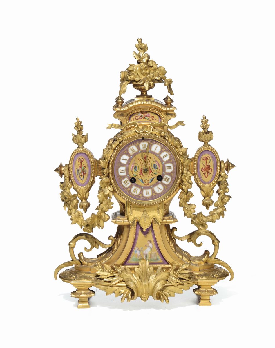 Pendola da tavolo Napoleone III in bronzo dorato e porcellana dipinta, XIX secolo